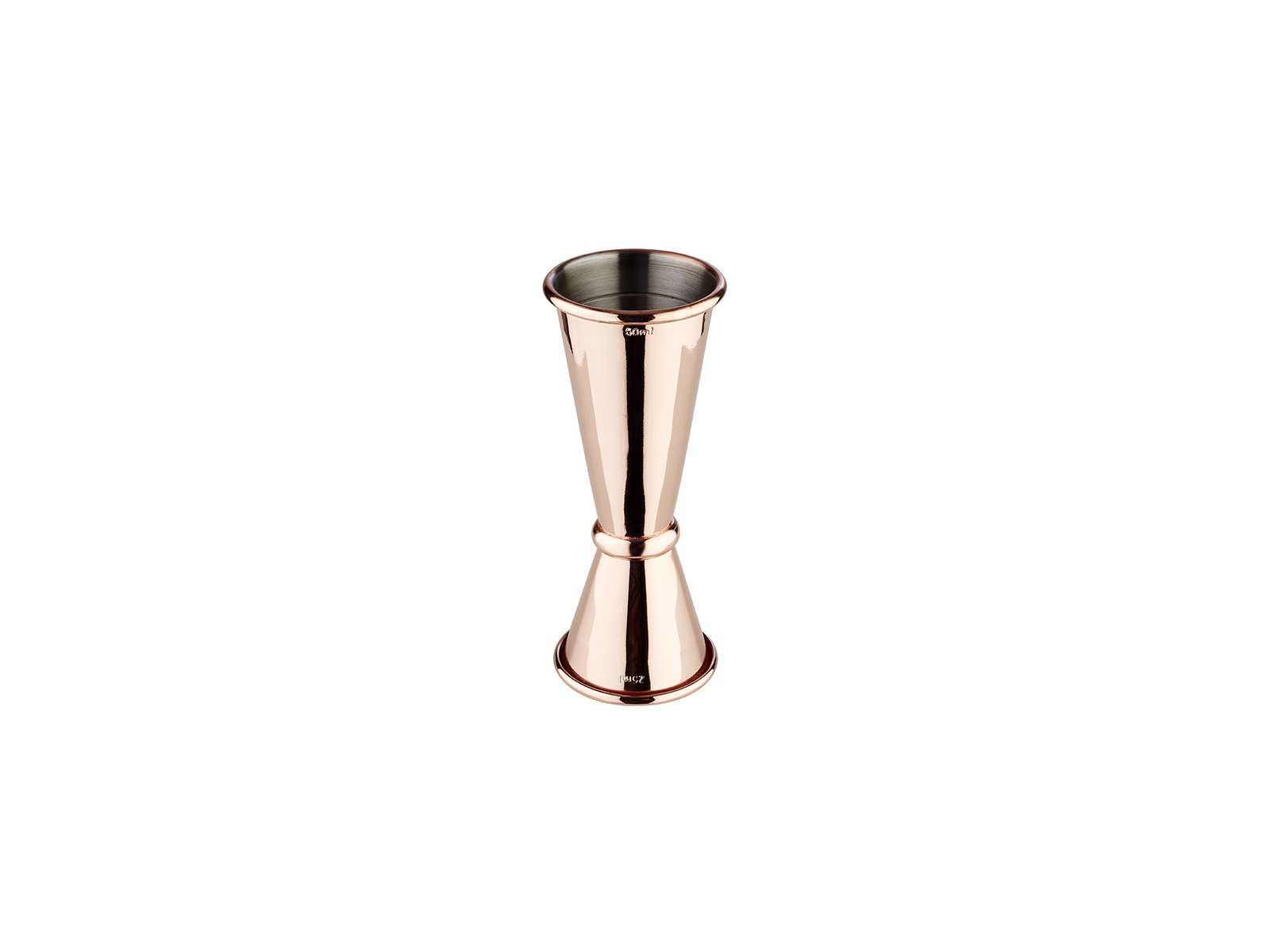 Mätbägaren har en total höjd på 110 mm och en diameter på 40 mm. Den väger 63 gram och har kapacitet att mäta 2,5 cl på ena sidan och 5 cl på den andra. Tillverkad i rostfritt stål med en blank kopparfinish, vilket säkerställer god hållbarhet vid korrekt underhåll. Observera att produkten ska handdiskas för att bevara det fina utseendet.