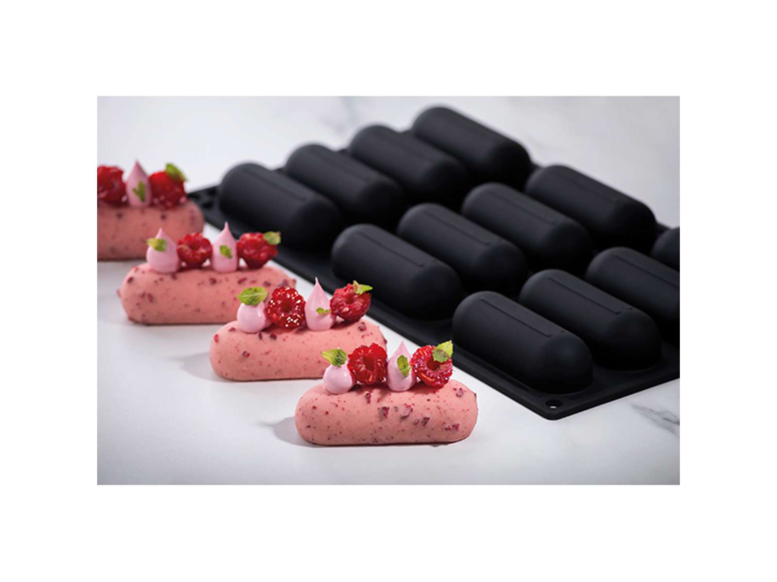 Pavoflex Confy silikonformen mäter 300 x 175 mm och väger 320 gram, vilket gör den lätt att hantera och förvara. Varje av de 12 fördjupningarna mäter 80 x 30 x 24 mm med en volym på 40 ml, perfekt för portionsstorlekar av desserter. Den svarta färgen ger inte bara ett professionellt utseende, utan hjälper också till att fördela värmen jämnt under bakning.