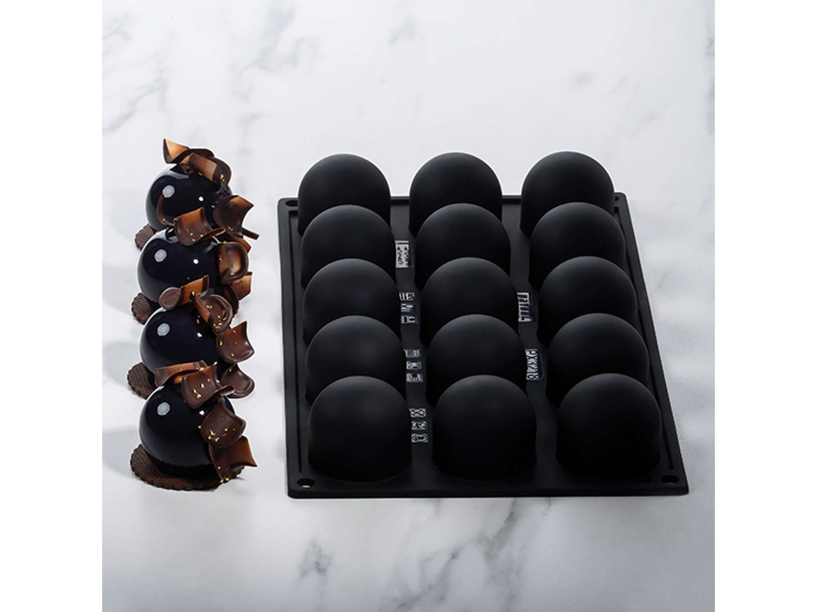 Pavoni Pavoflex Sphere40time är en professionell silikonform utvecklad i samarbete med den erkända konditorn Antonio Bachour. Med 15 sfäriska fördjupningar på en platta ger denna form dig möjlighet att skapa enhetliga, professionella desserter med exakt samma storlek och form varje gång. Den svarta silikonformen mäter 300x175 mm och har fördjupningar med en diameter på 43 mm.