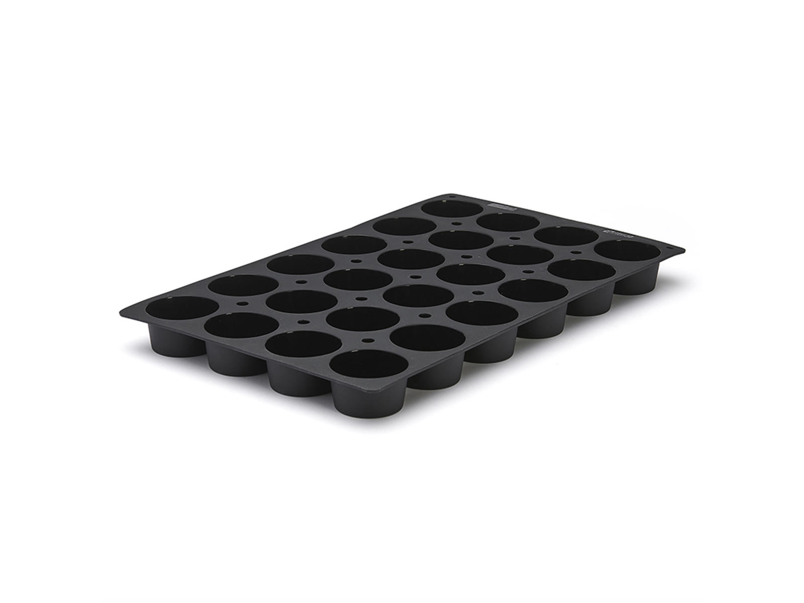 Tillverkad av platinum-silikon utan peroxider, vilket ger överlägsen hållbarhet och säkerhet. Måtten är 325 x 555 mm (GN1/1) med 24 individuella formar. Tål temperaturer från -40°C till +300°C, vilket gör den användbar både för bakning och frysning. Den svarta färgen säkerställer optimal värmeabsorption, medan den släta ytan ger en effektiv non-stick effekt.