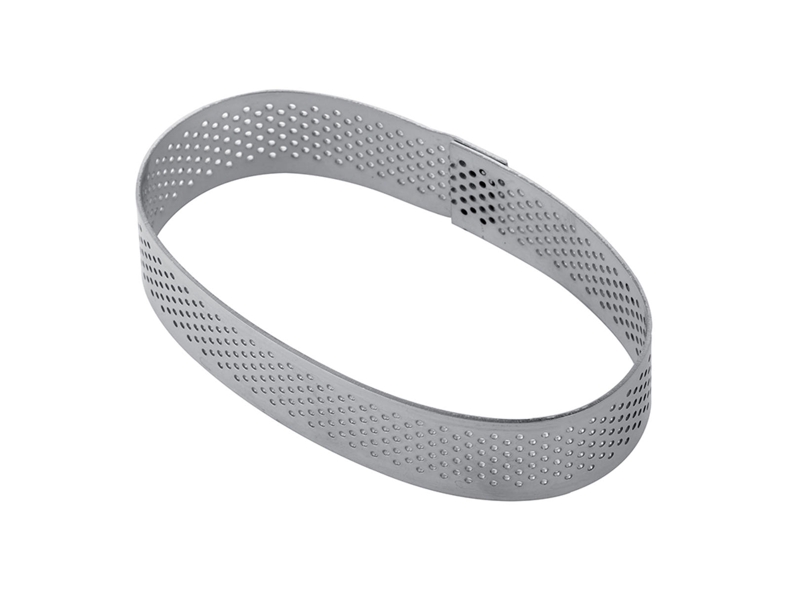 Bakringen mäter 96 mm i längden, 57 mm i bredden och har en höjd på 20 mm, vilket ger den den perfekta storleken för individuella portioner. Den är tillverkad av livsmedelsgodkänt rostfritt stål, vilket är både hygieniskt och hållbart. Den ovala formen kombinerad med den perforerade designen ger inte bara funktionella fördelar, utan också ett visuellt tilltalande slutresultat på dina bakverk.