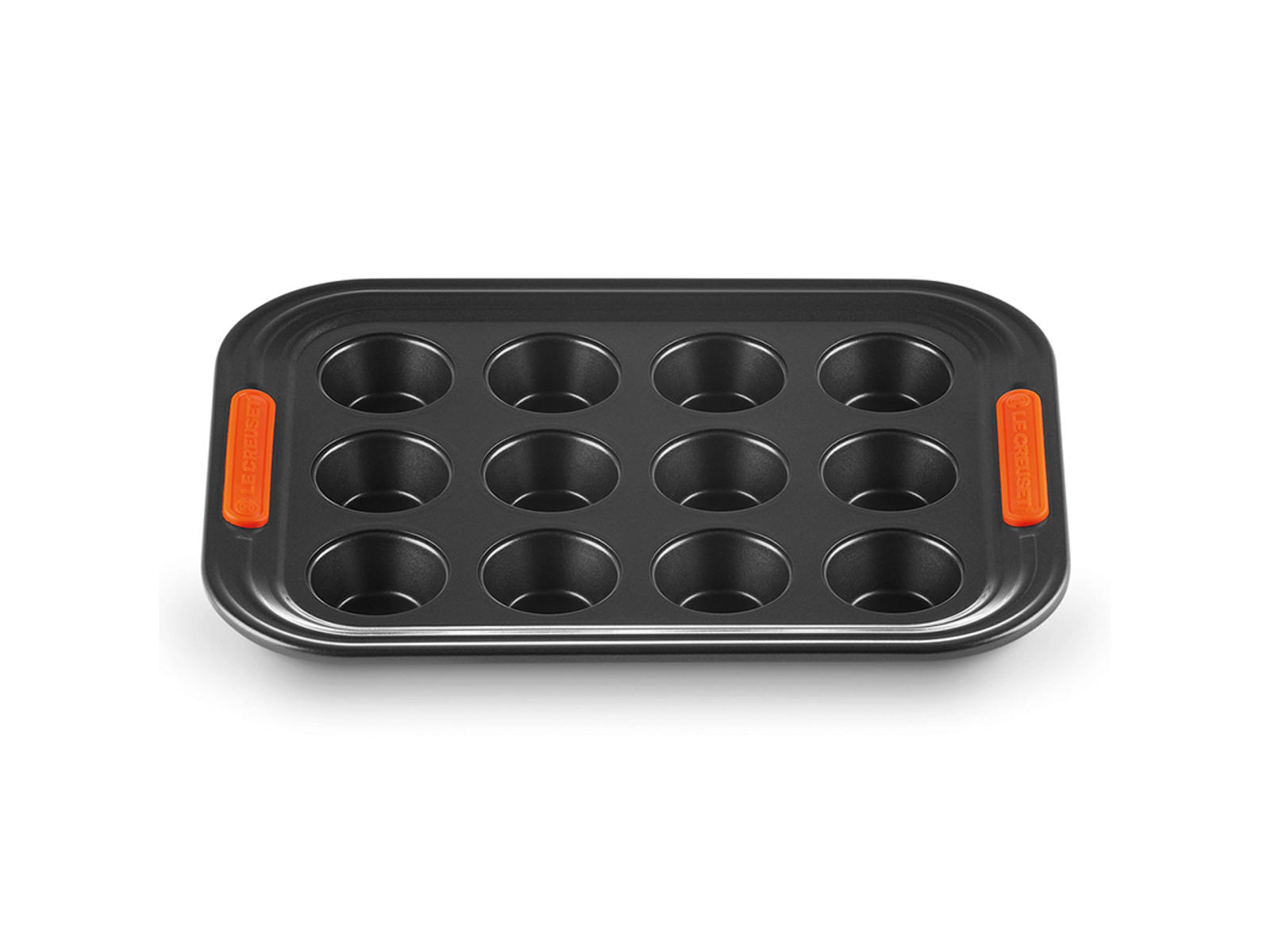 Le Creusets muffinsform i kolstål ger dig möjlighet att baka 12 enhetliga mini-muffins, cupcakes eller små pajer på en gång. Med sina värmetåliga silikonhandtag och dubbla non-stick-beläggning säkerställer denna 30x22 cm form att dina små bakverk blir jämnt bakade och lätta att få ut ur formen.