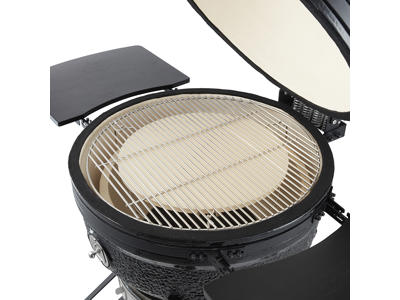 Denna premium Kamado keramikgrill i svart med en diameter på 66 cm kombinerar robust konstruktion med mångsidig matlagning. De keramiska väggarna och pulverlackerade ståldelarna säkerställer optimal värmekontroll och hållbarhet, medan justerbara luftöppningar ger dig exakt temperaturstyrning. Idealisk för både grillning, rökning, bakning och ångning av dina favoritmåltider.