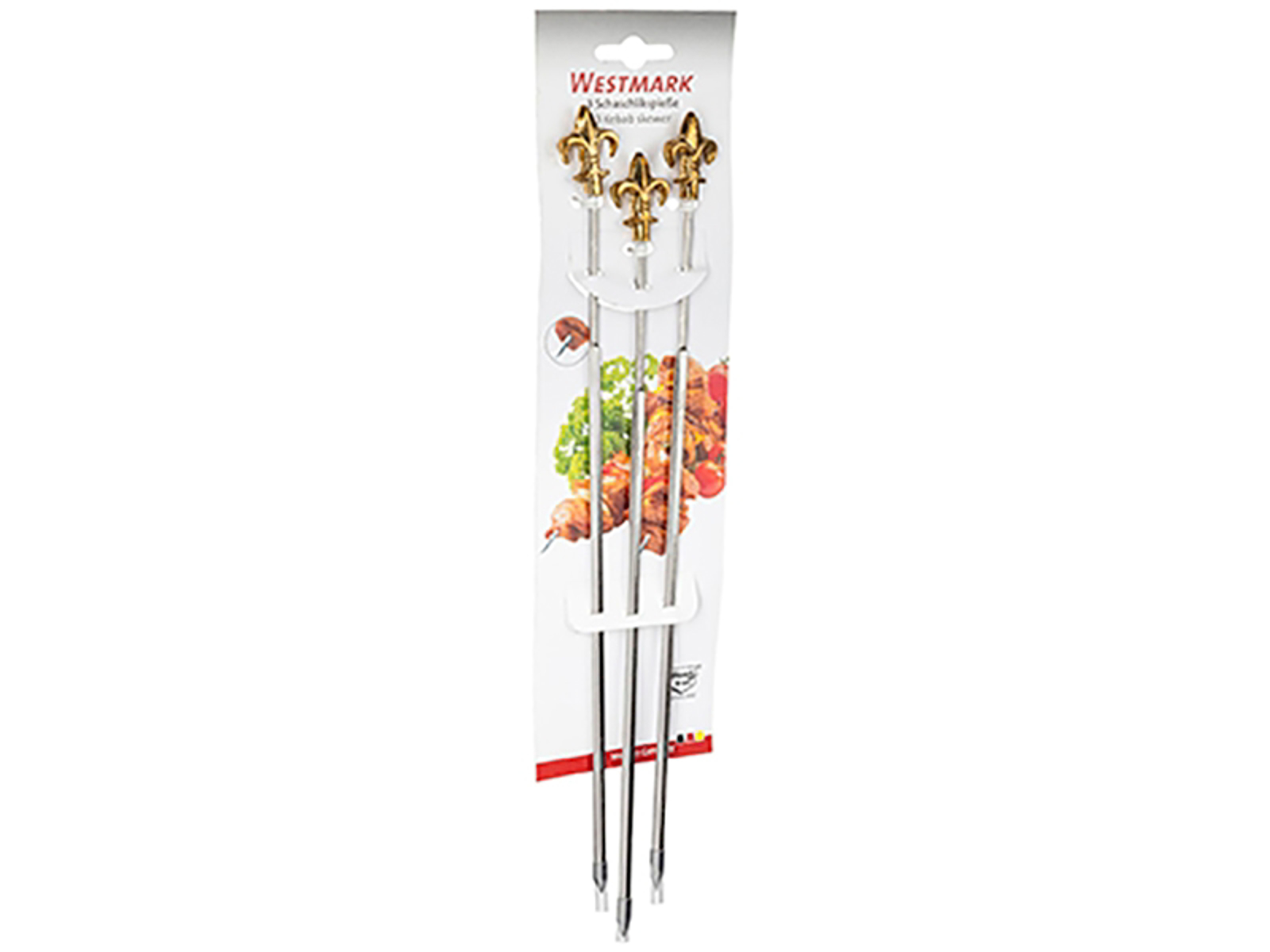 Dessa kvalitets grillspett från Westmark är tillverkade av rostfritt stål med dekorativa mässingshandtag i liljedesign. Setet innehåller tre 23 cm långa spett, som med sin platta form säkerställer att kött och grönsaker inte roterar under tillagningen. De skarpa spetsarna gör det enkelt att fästa ingredienserna.