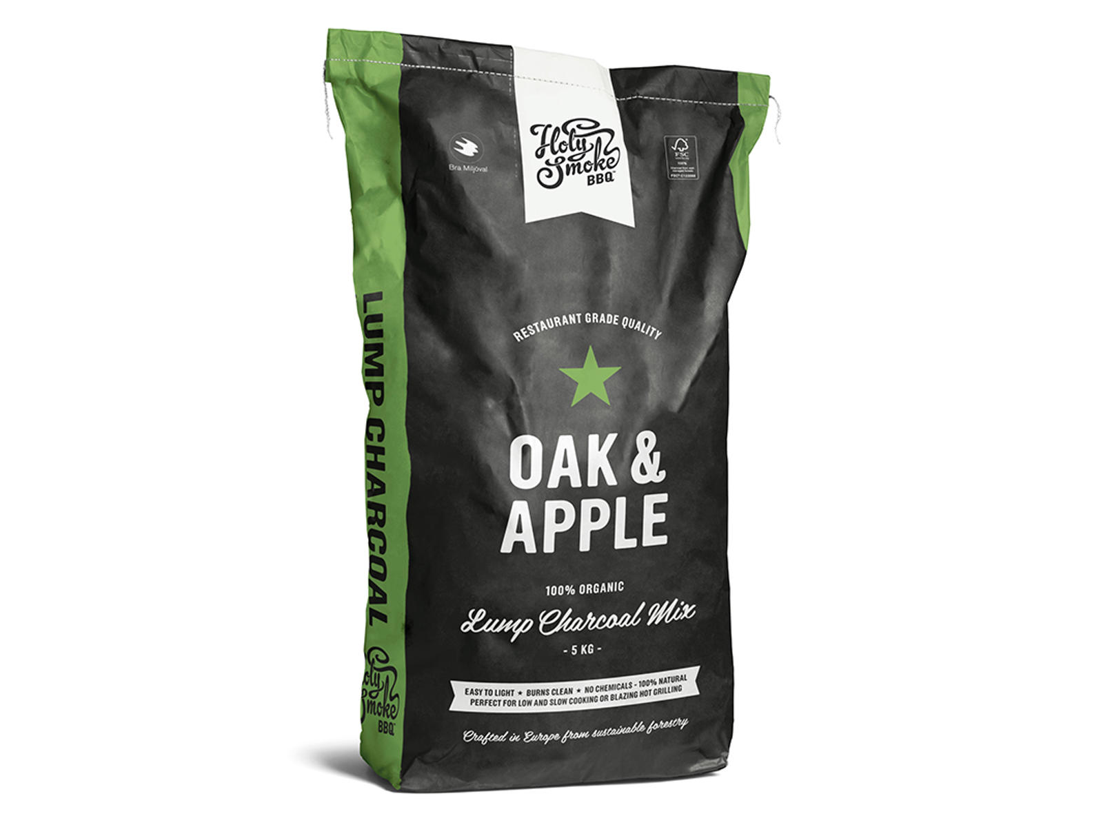 Denna 5 kg påse kull från Holy Smoke BBQ består av en noggrant avvägd blandning med 70% ek och 30% äppelträ. Kullblandningen är FSC-certifierad, 100% naturlig och helt fri från kemikalier. Med en vikt på 5 kg räcker påsen till flera grilltillfällen, oavsett om du ska laga mat till vardags eller fest.
