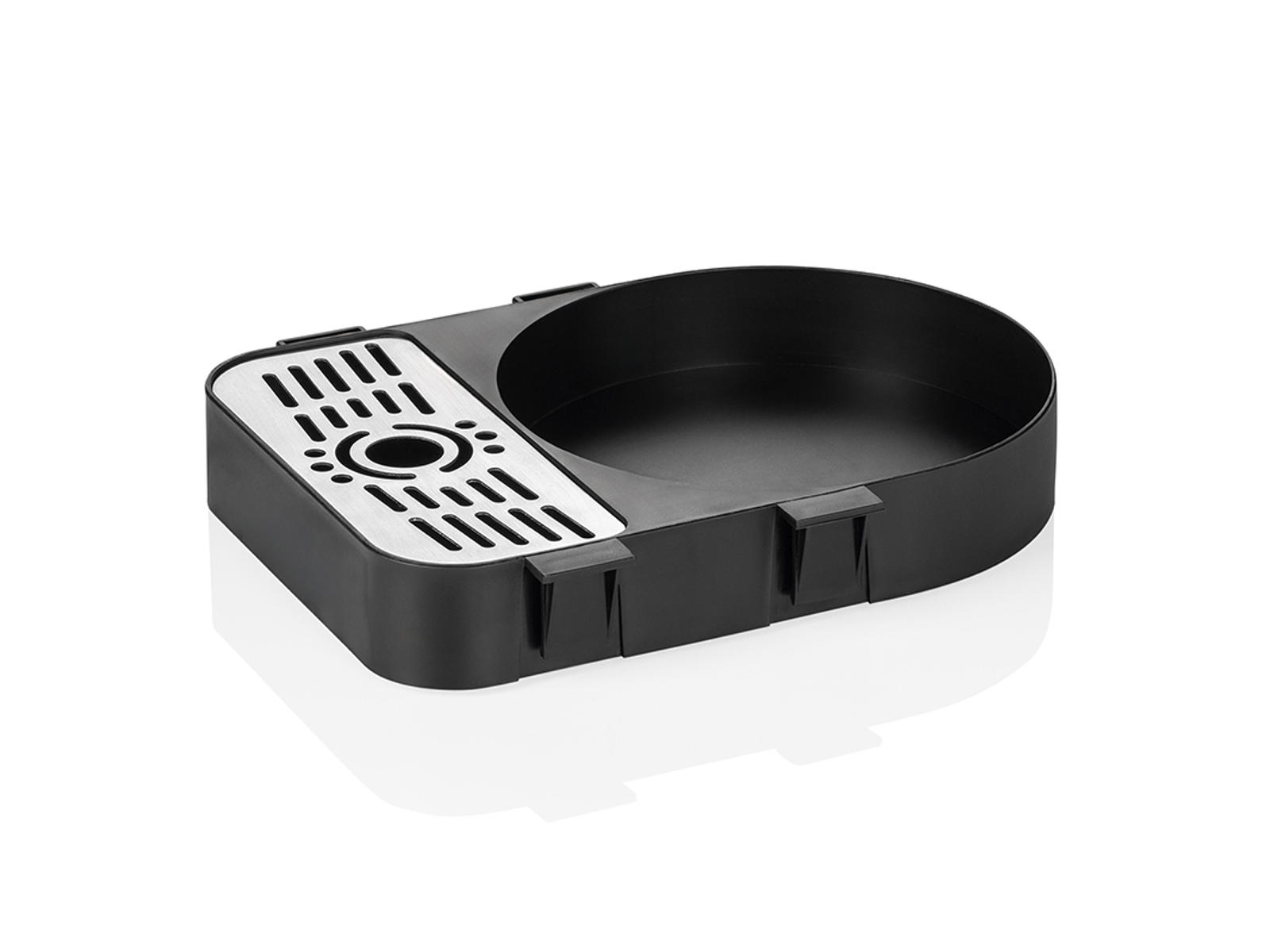 Droppskålen kan rengöras med vanliga rengöringsmedel som är lämpliga för köksbruk. Den är designad för att vara lätt att ta ut, tömma och rengöra.
