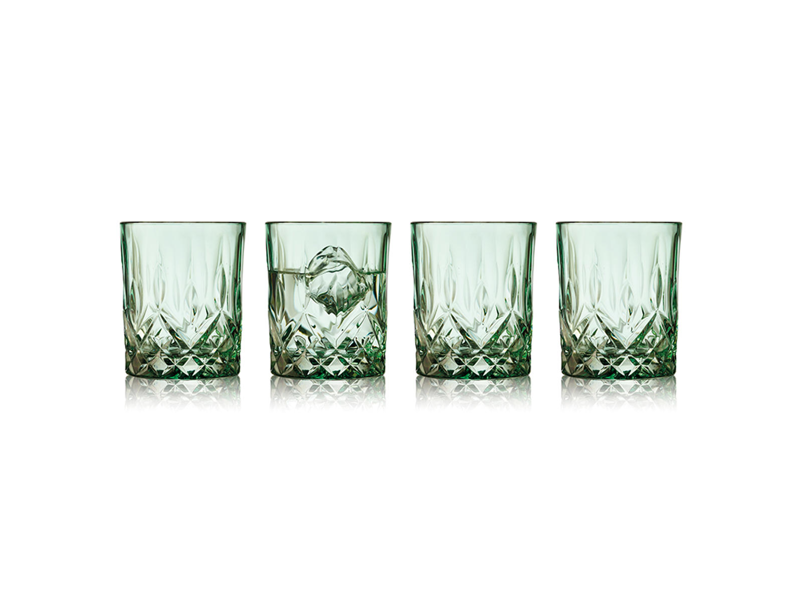Lyngby Sorrento whiskyglas är tillverkade av genomfärgat grönt glas med en kapacitet på 32 cl. Setet innehåller 4 glas med en totalvikt på 1120 gram. Glasen tål diskmaskin, vilket gör rengöringen enkel och bekväm. Den facetterade ytan ger glasen deras karaktäristiska utseende och säkerställer samtidigt ett bra grepp.