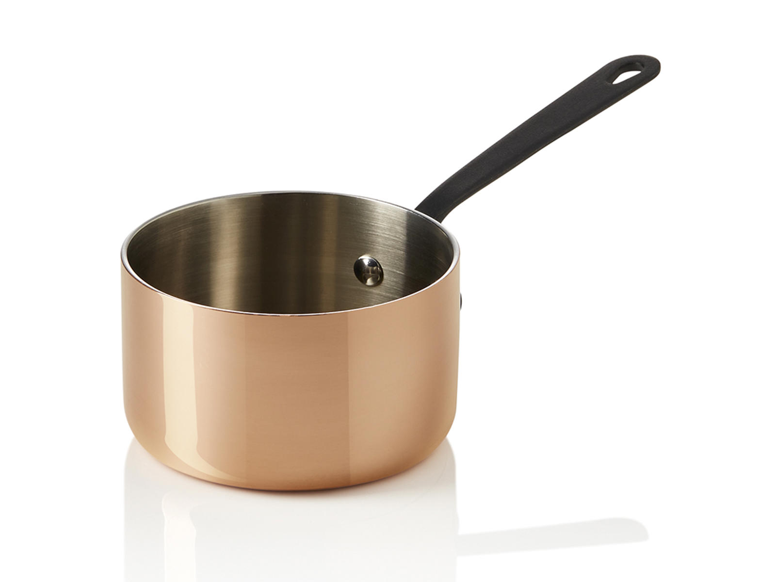 De solidt nittade handtagen i svart ger ett säkert grepp, även när du arbetar under hektiska förhållanden. Med en höjd på 60 mm och en vikt på endast 300 gram är kastrullen lätt att hantera, samtidigt som den har tillräcklig kapacitet för individuella serveringar. Kombinationen av den blanka kopparen på utsidan och den svarta finishen skapar ett visuellt uttryck som lyfter varje bordservering och signalerar professionell kvalitet. Observera att kastrullen ska handdiskas för att bevara det vackra utseendet och de funktionella egenskaperna.