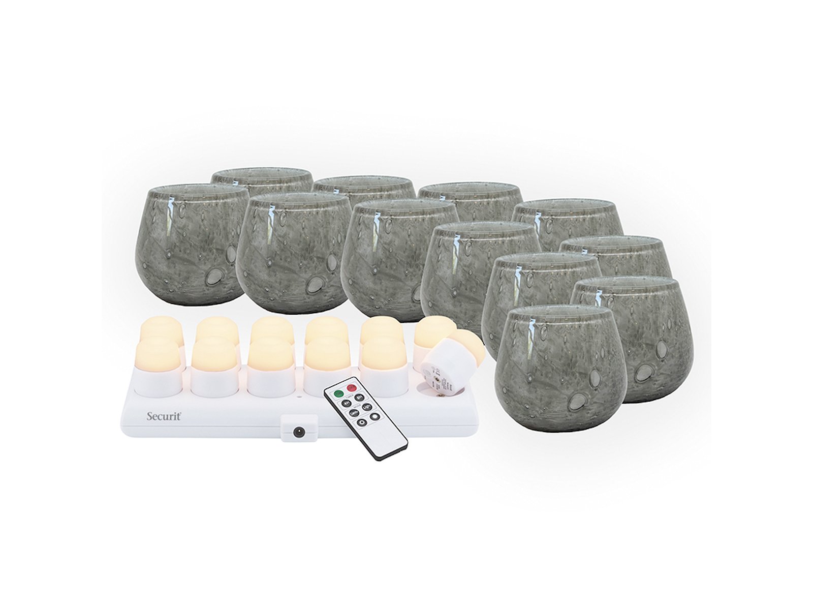 Securit Luna ljusstakset kombinerar elegant mundblåst glasdesign med modern LED-teknologi. Satsen innehåller 12 grå ljusstakar tillverkade av återvunnet glas, var och en med sitt unika mönster, samt 12 LED-tealight med realistisk lågeffekt. Detta set är tillverkat i EU och designat för både professionella miljöer och hemmabruk.