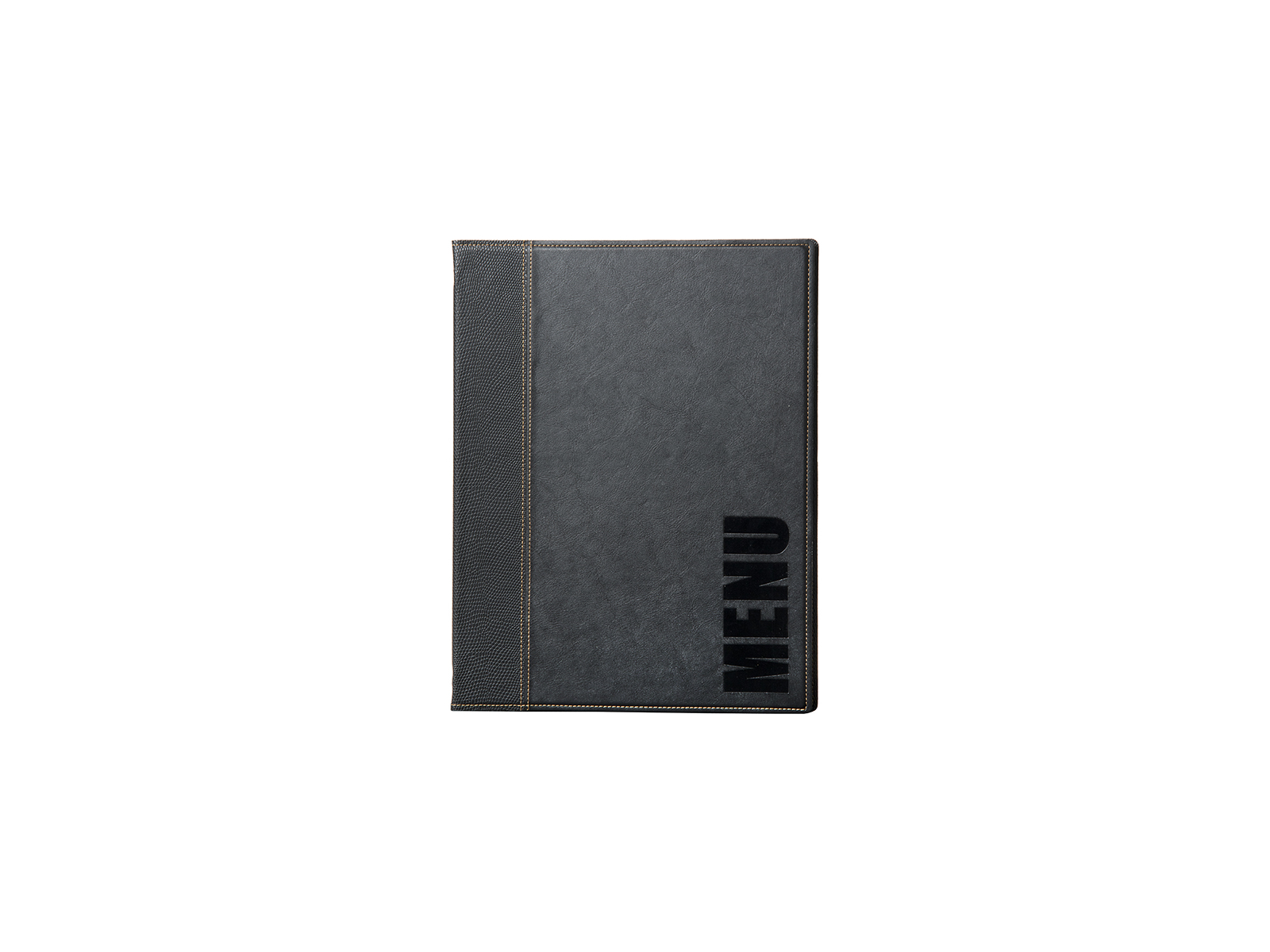 Menykortet mäter 353 mm i höjd, 186 mm i längd och har ett djup på 10 mm. Det svarta PU-materialet ger ett tidlöst intryck som passar in i många olika inredningsstilar. Standardkonfigurationen inkluderar plats för 1 uppslag/4 sidor, men kan som nämnts utökas avsevärt efter behov.