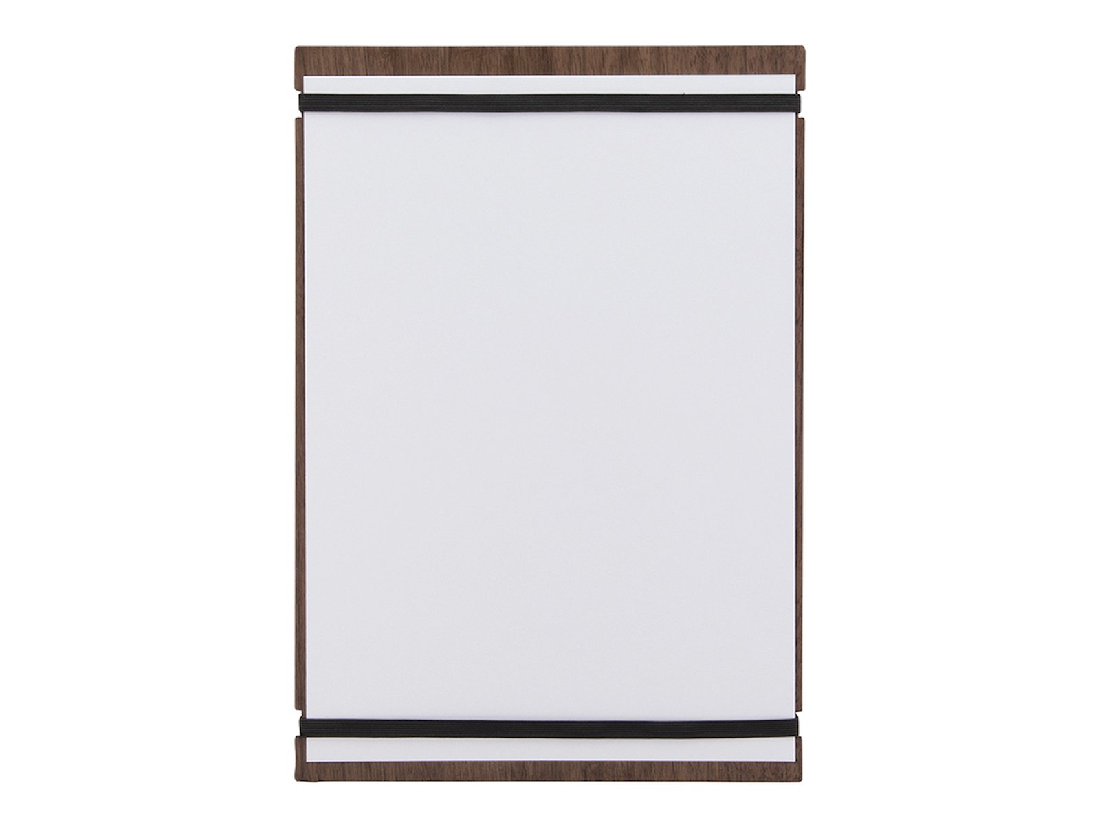 Menyhållaren mäter 330 mm i höjd, 230 mm i bredd och har en djup på 30 mm. Den väger 260 gram vilket ger den god stabilitet på bordet. Materialet är äkta valnötsträ med en skyddande lackering, och menyerna fästs enkelt med de medföljande svarta elastiska banden som går runt hållaren.