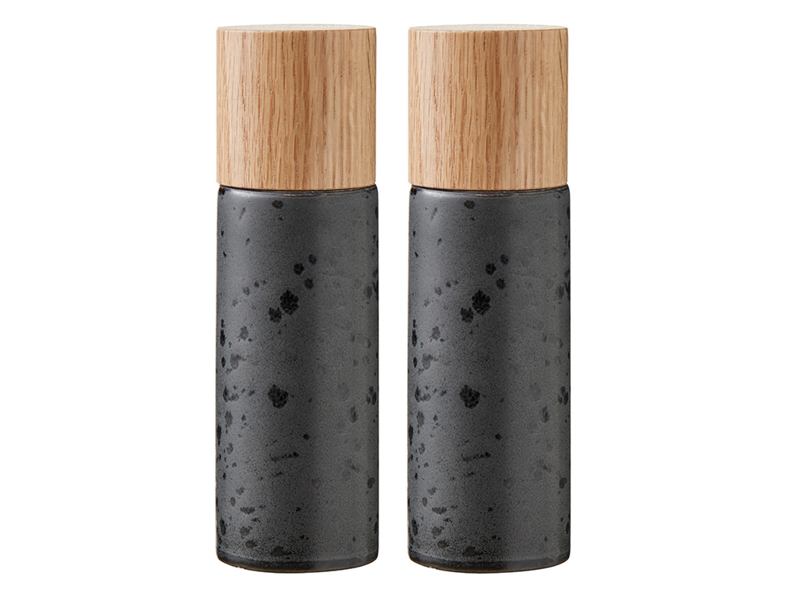 Kombinationen av det svartglaserade stengodset och det varma ekträet skapar en sofistikerad kontrast som harmoniserar med många olika dukningar. Den reaktiva glasyren gör att varje set får sitt eget unika färgspektrum och karaktär. Kvarnarna ligger bra i handen tack vare sin genomtänkta form, vilket gör dem behagliga att använda vid bordet.