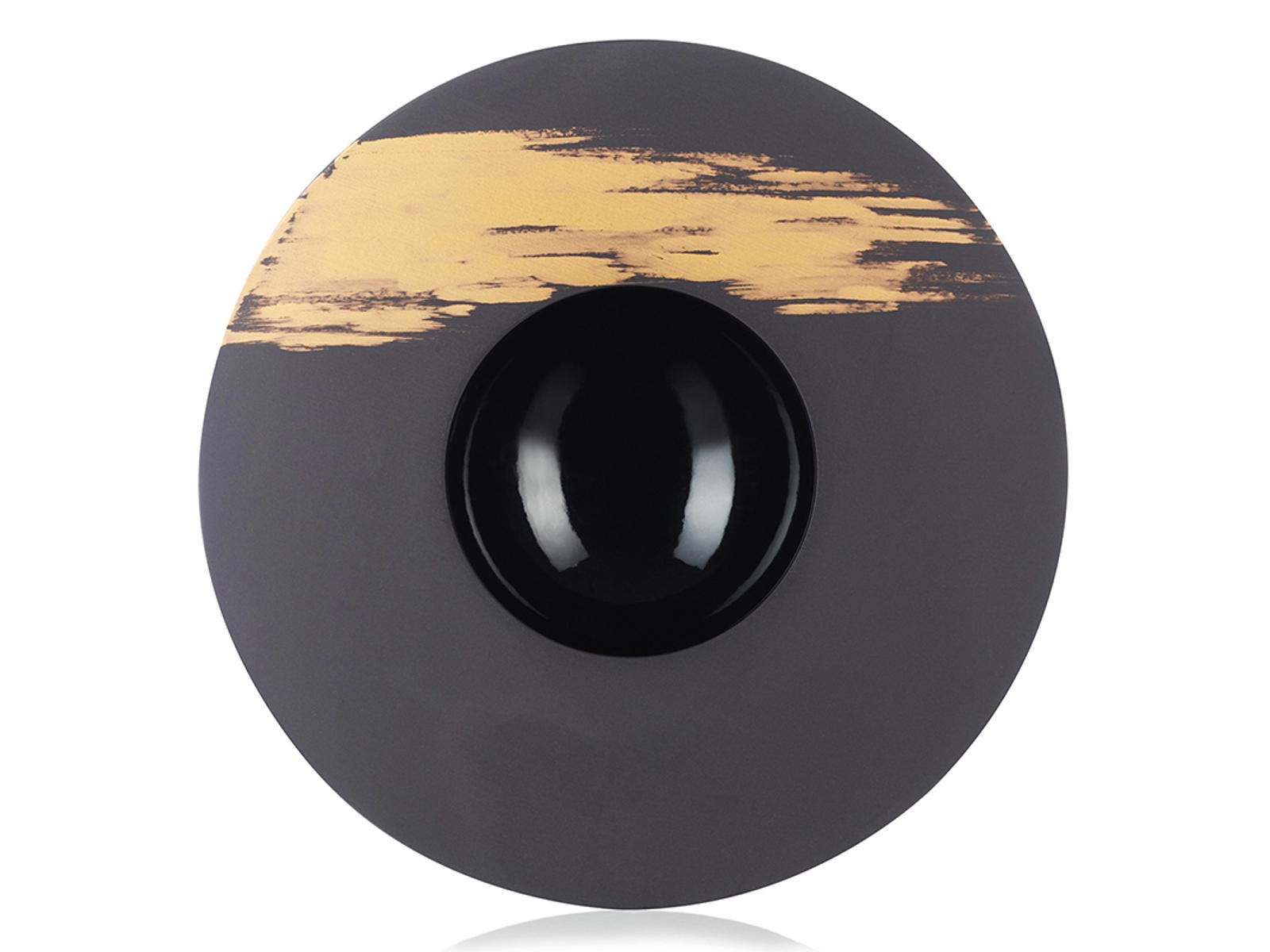 Denna djupa tallrik från Revol Porcelæn är designad för gastronomiska presentationer med sin 30 cm diameter och 50 mm djup. Det raffinerade samspelet mellan råvarorna och den blanka svarta emaljen skapar en elegant kontrast med guldkanten, som framhäver även de mest färgstarka rätterna.