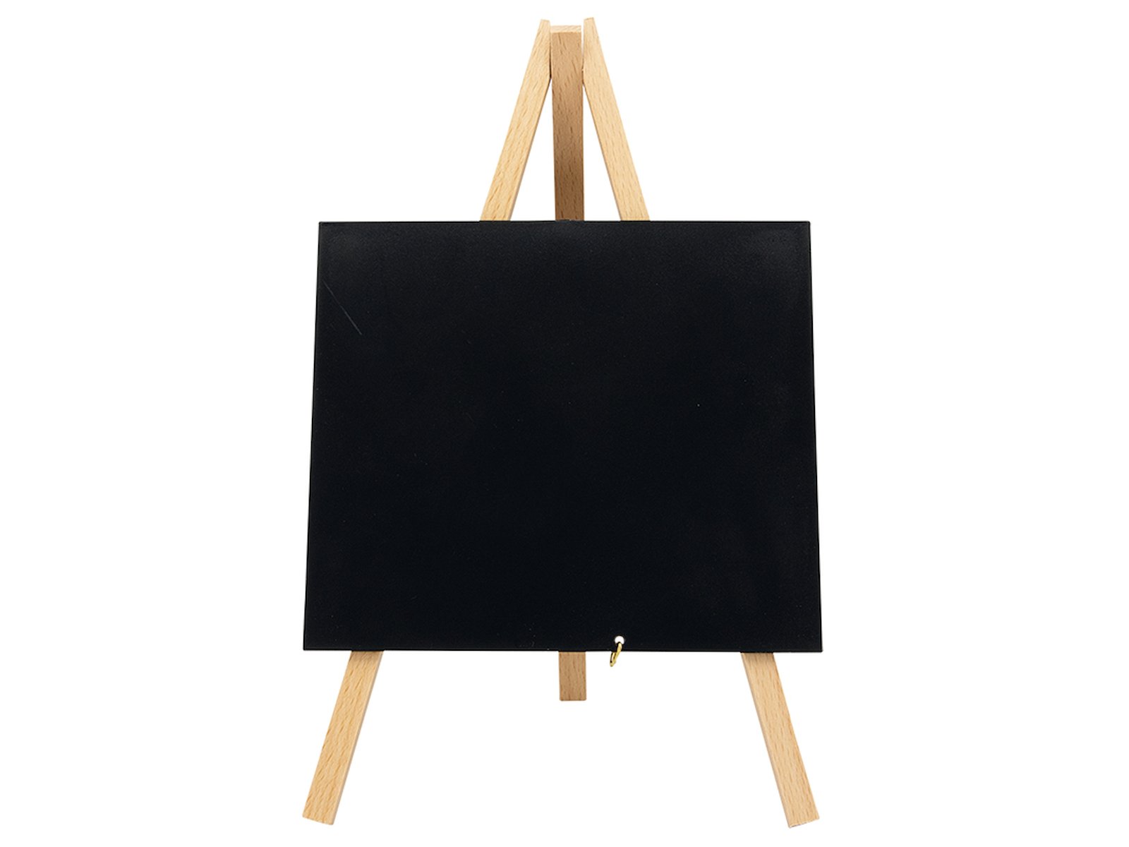 Ministället är tillverkat av kvalitetsbok med en elegant lackad yta som ger ett professionellt uttryck. Den fastmonterade svarta tavlan är särskilt behandlad för att vara reptålig, UV-säker och väderbeständig. Detta innebär att du kan använda stället både inomhus och utomhus utan att oroa dig för skador från väder eller daglig användning. Den robusta konstruktionen säkerställer lång livslängd även vid frekvent användning i hektiska miljöer.