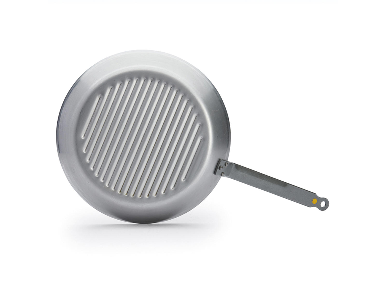 Denna Mineral B grillpanna från de Buyer är tillverkad av 100% naturligt kolstål (järn) med en diameter på 32 cm. Med sina karaktäristiska grillränder lyfter den dina rätter till nya höjder genom att ge dem vackra grillränder, samtidigt som överflödigt fett leds bort. Pannans järnkonstruktion säkerställer snabb och jämn värmefördelning.