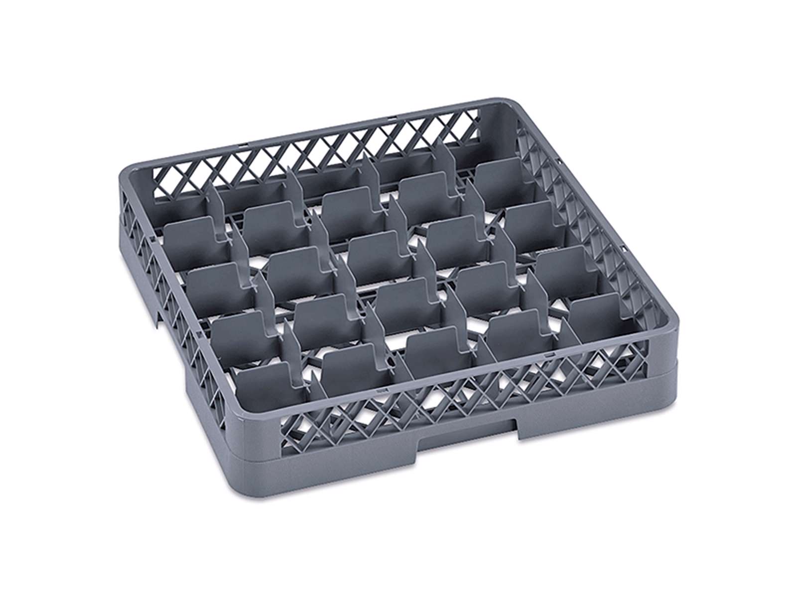 Tillverkad av slitstark polypropylen som tål upprepad användning och höga temperaturer. Brickan mäter 500x500x100 mm och har 25 fack på varje 9,2x9,2x9,2 cm, perfekt dimensionerade för standarddricksglas. Den grå färgen är praktisk i daglig användning och hjälper till att dölja mindre missfärgningar över tid.