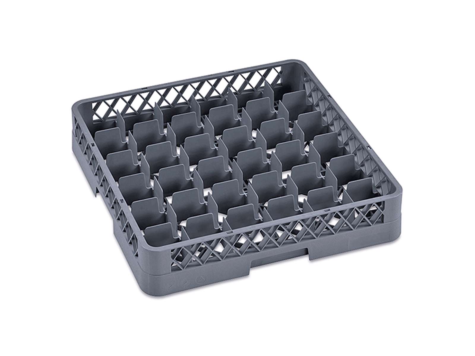 Brickan mäter 500x500x100 mm och har 36 rum, som var och en mäter 7,5x7,5 cm med ett djup på 8,7 cm. Tillverkad av hållbar polypropylen i grå färg, som är motståndskraftig mot vatten, kemikalier och temperaturer från industriella diskmaskiner. Standardstorleken säkerställer kompatibilitet med det mesta professionella diskutrustning.