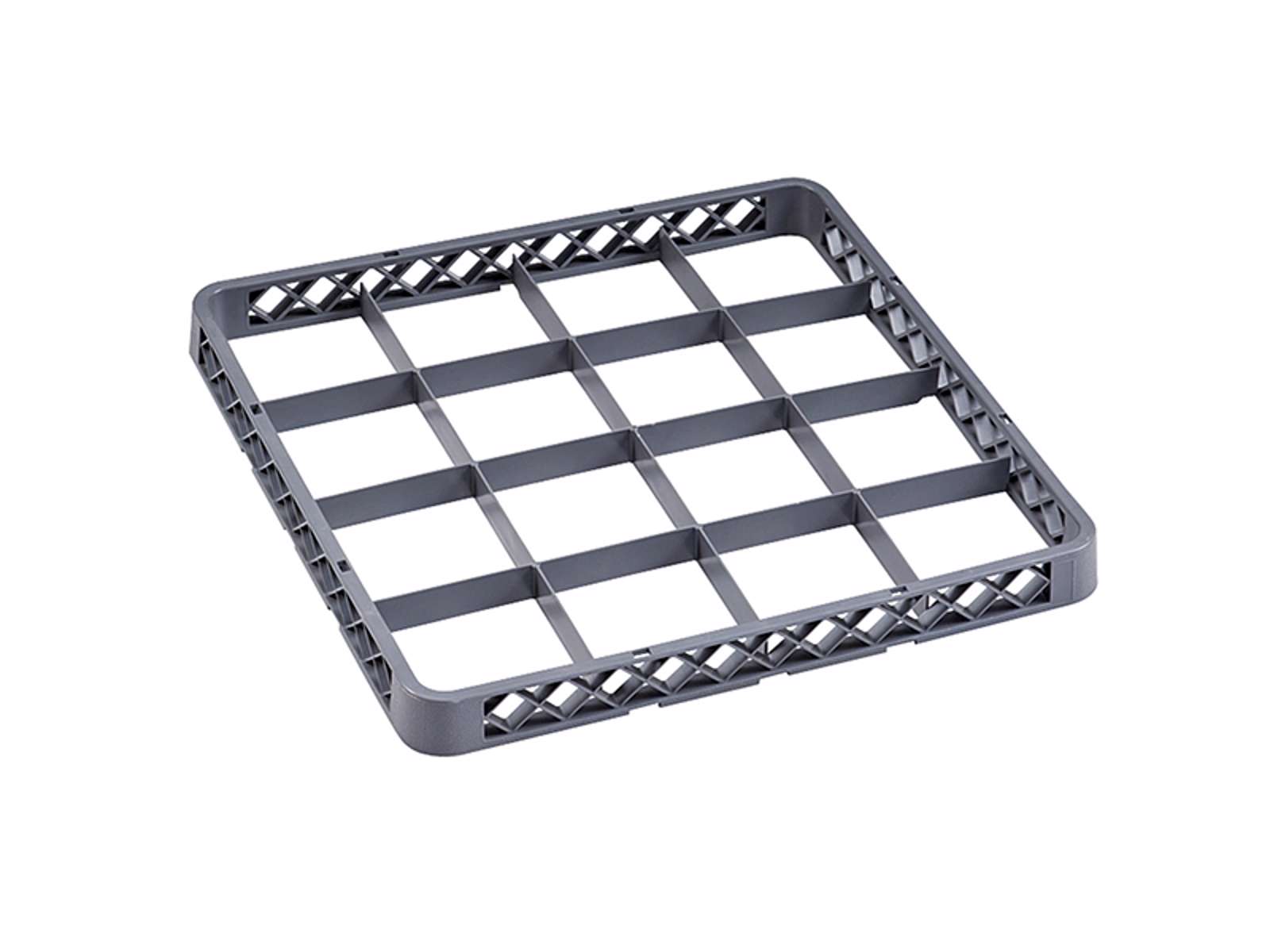 Tillverkad i slitstark grå polypropylen, som tål höga temperaturer och upprepad användning. Måtten är 500x500x45mm, vilket passar standardbackar i professionella diskmaskiner. De 16 separata facken är designade för att rymma olika typer och storlekar av glas, samtidigt som de hålls säkert åtskilda under hela diskprocessen.