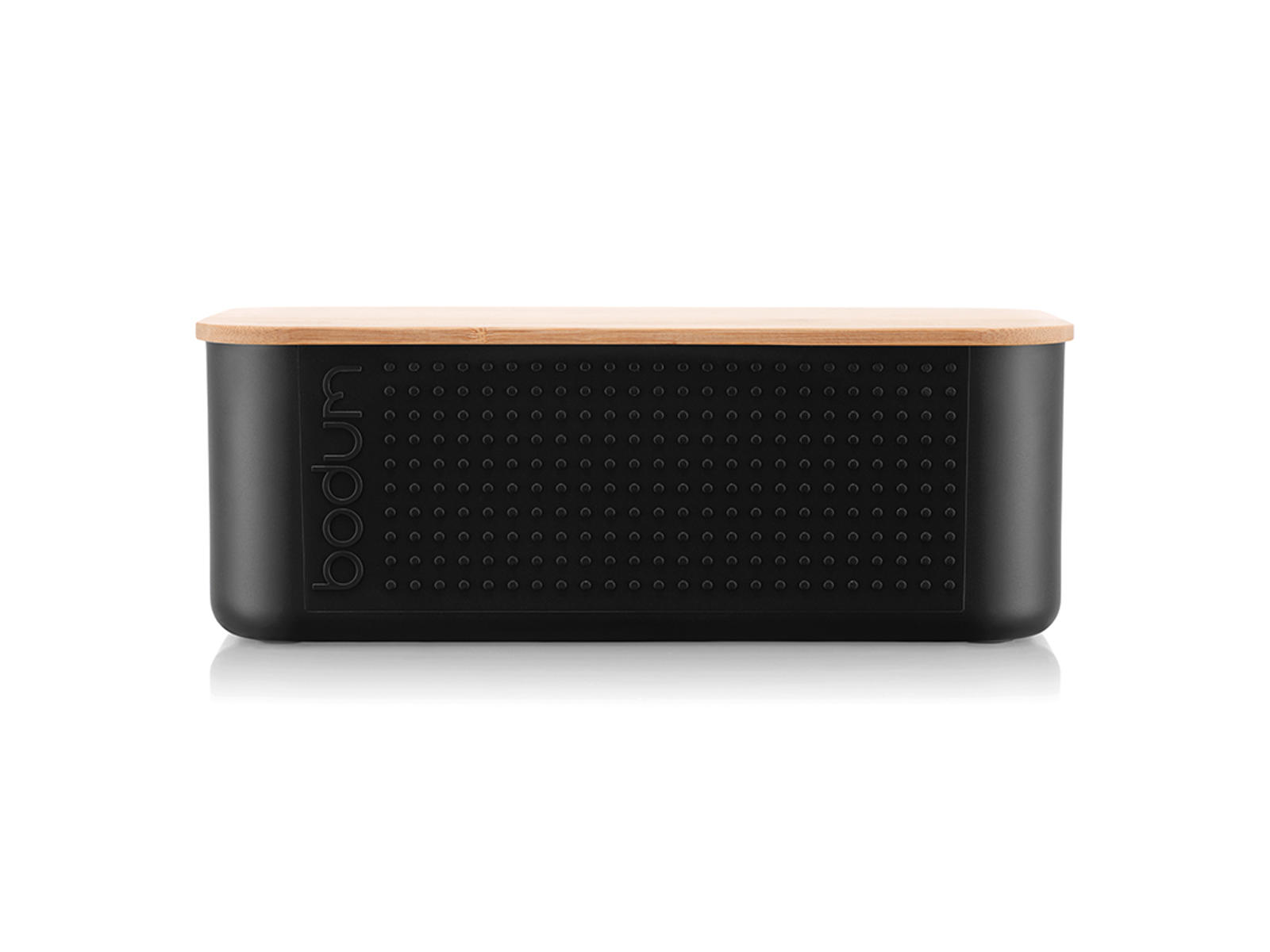 Brödboxen från Bodums Bistro-serie har en längd på 29,4 cm, en bredd på 19,4 cm och en höjd på 10,7 cm. Den är tillverkad av en kombination av BPA-fri plast, bambu och gummi. Färgen är svart med det naturliga bambulocket som kontrast. Observera att endast plastboxen tål diskmaskin, medan bambulocket ska rengöras manuellt.
