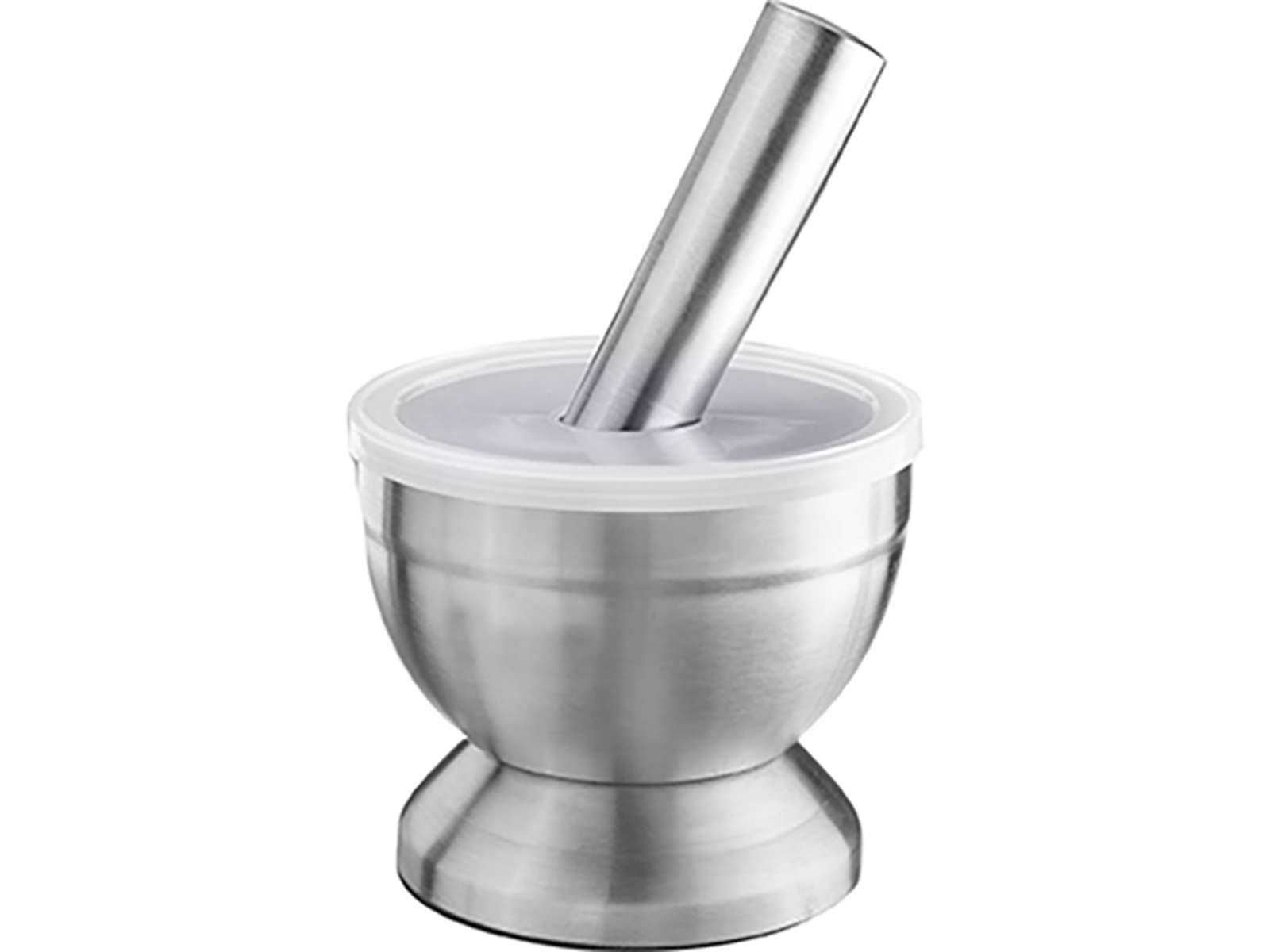 - En hållbar mortel i rostfritt stål med praktiskt lock