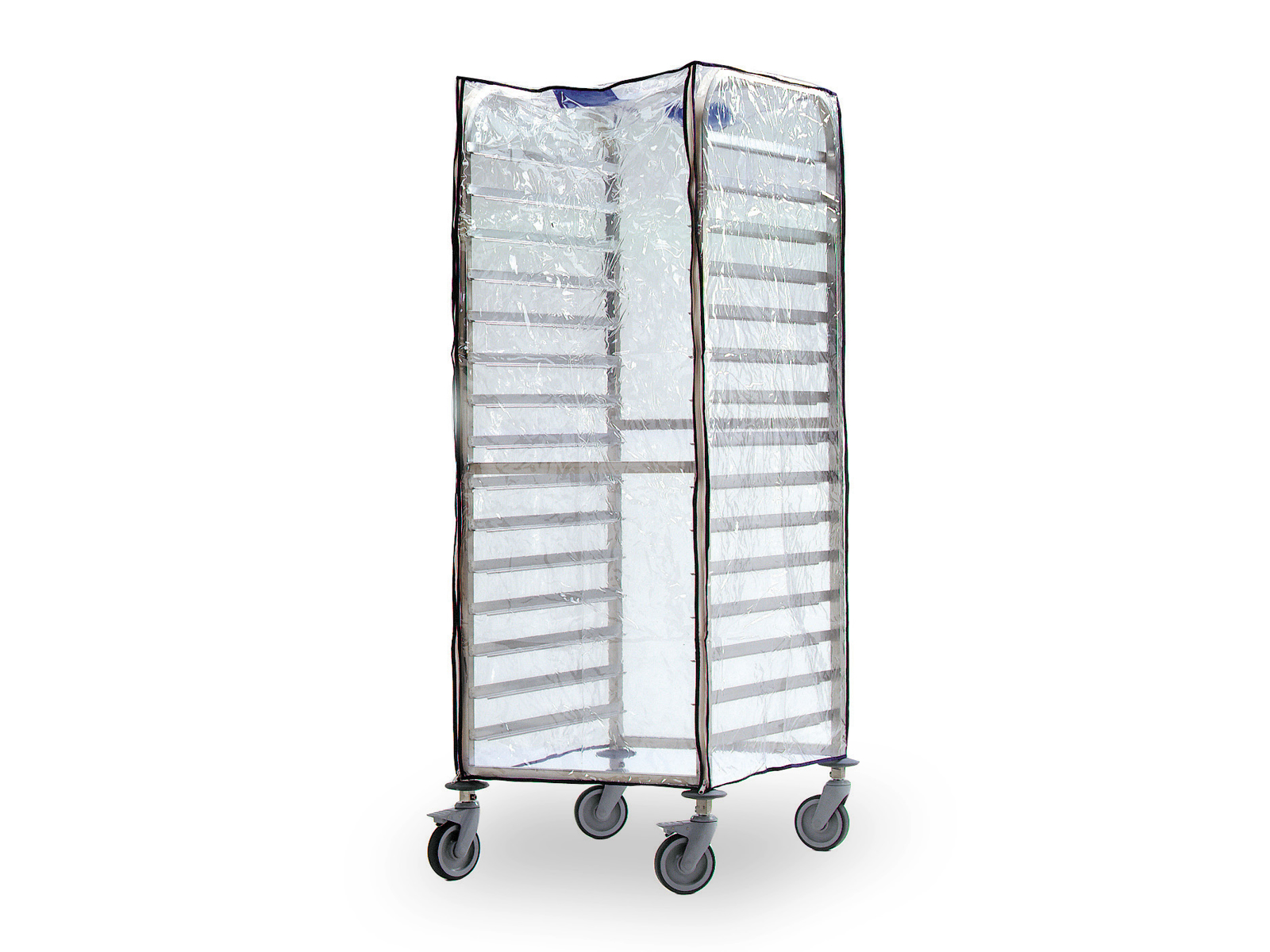 Den antibakteriella behandlingen av materialet ger ett extra hygieniskt skydd i miljöer där livsmedelssäkerhet är av största vikt. Med en tjocklek på 130 mikron är överdraget tillräckligt robust för daglig användning och samtidigt transparent, så att du enkelt kan se innehållet i vagnen. De förstärkta dragkedjorna är designade för upprepad användning utan att gå sönder, vilket säkerställer lång livslängd även i hektiska professionella kök.