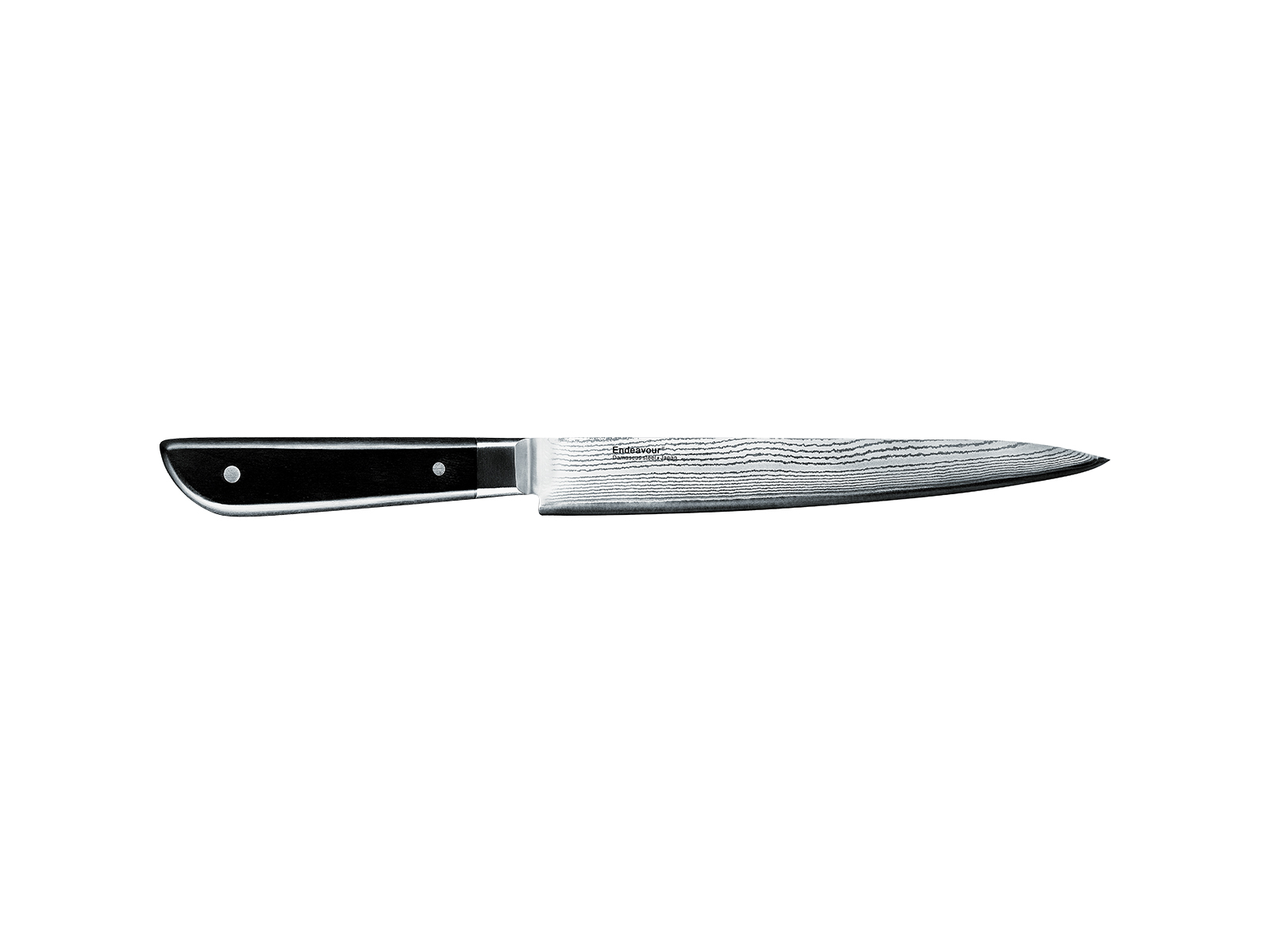 Skärkniven från Endeavours Discovery Pro-serie är utvecklad för professionell hantering av kött och fjäderfä. Med sitt 20 cm långa, smala blad i 67-lagers damaskusstål och ergonomiskt handtag av pakkaträ ger kniven dig optimal kontroll och precision vid skärning. Den är idealisk för att ta bort senor, trimma fett och skära perfekta skivor av stek.