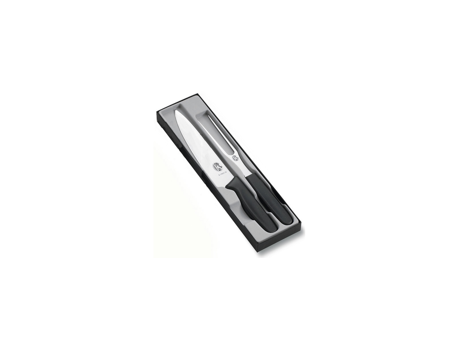 Victorinox Swiss Classic skärset består av en 19 cm skalkniv och en 15 cm köttgafl i rostfritt stål med Fibrox-handtag. Detta professionella 2-delade set är designat för exakt skärning av kött, där kniven skär jämnt genom fibrerna, medan gaffeln säkerställer stabil hantering av köttet under arbetet.