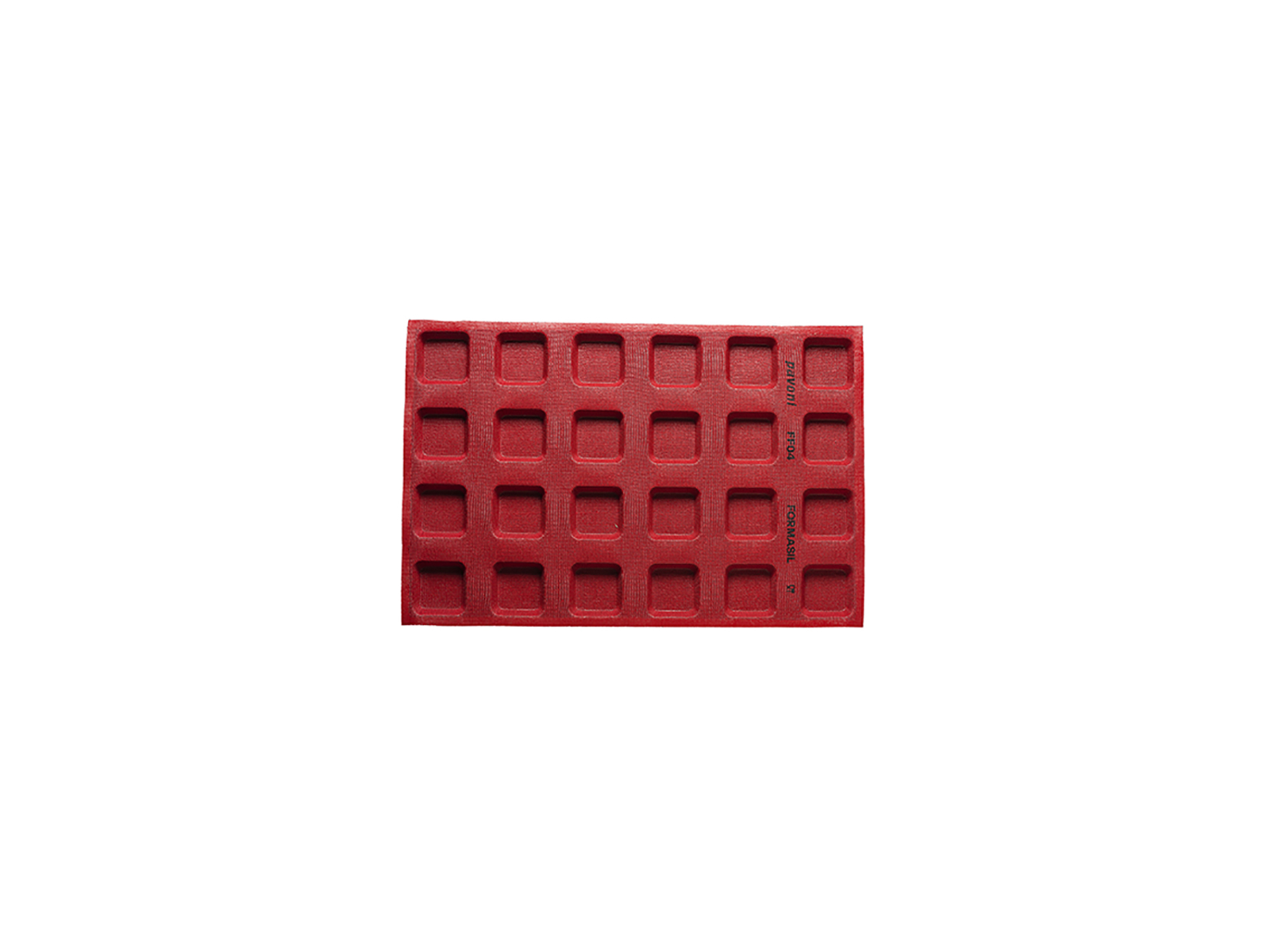 Pavonis röda Formasil bakform i flexibel silikon ger dig 24 enhetliga fyrkantiga kreationer varje gång. Med en total storlek på 400 x 600 mm och individuella formar på 65 x 65 mm med en höjd på 20 mm, får du ett mångsidigt verktyg för både söta och salta kök.