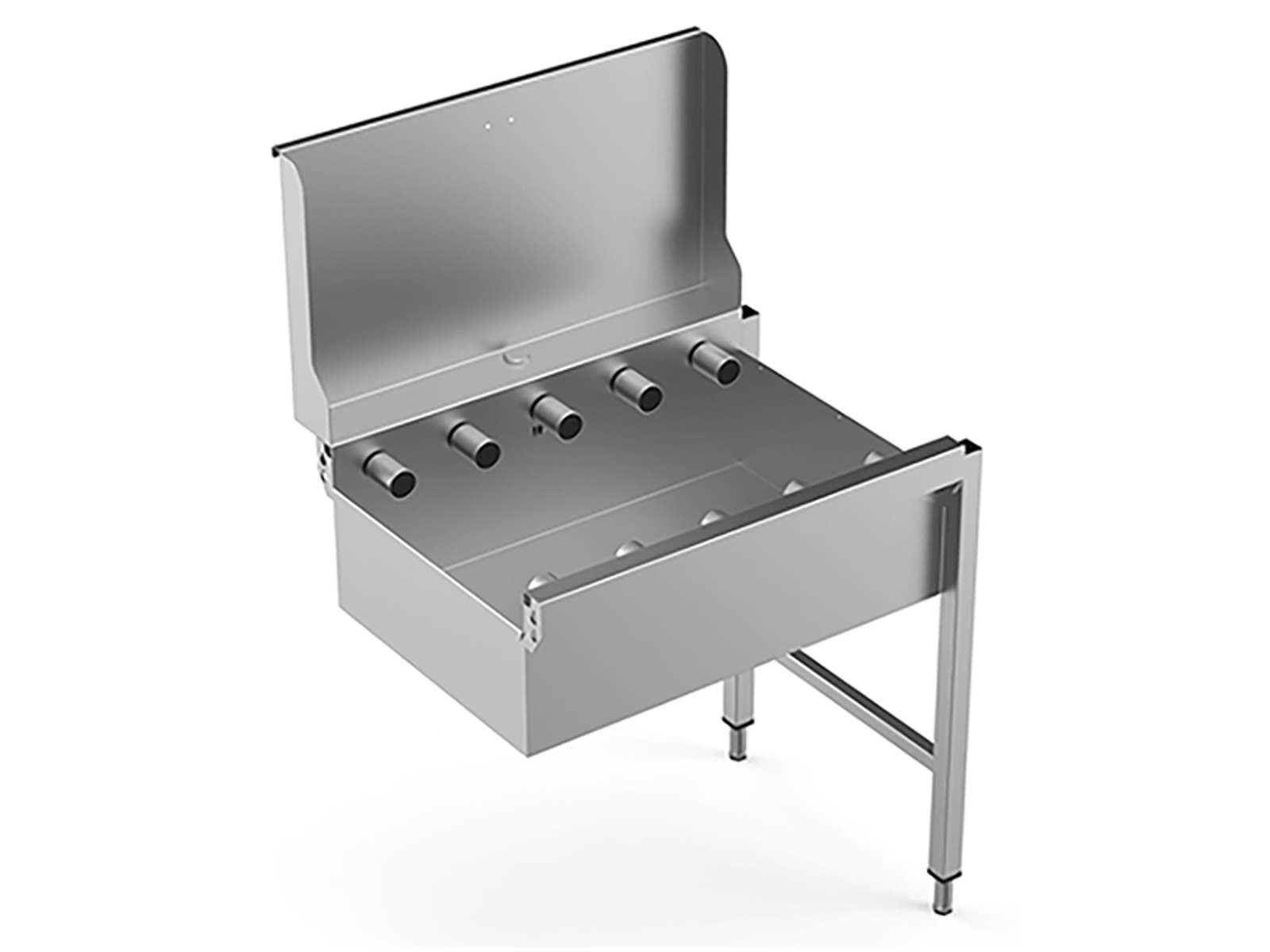 Torkbordet har en praktisk storlek på 600x600mm, vilket ger gott om utrymme för att hantera diskbackar både före och efter diskning. De justerbara benen kan anpassas med ±50mm, så bordet lutar lätt mot diskmaskinen och säkerställer att vattnet leds bort effektivt. Bordets konstruktion med djupa och droppfria profiler förhindrar vattenspill på golvet och minimerar risken för arbetsolyckor.