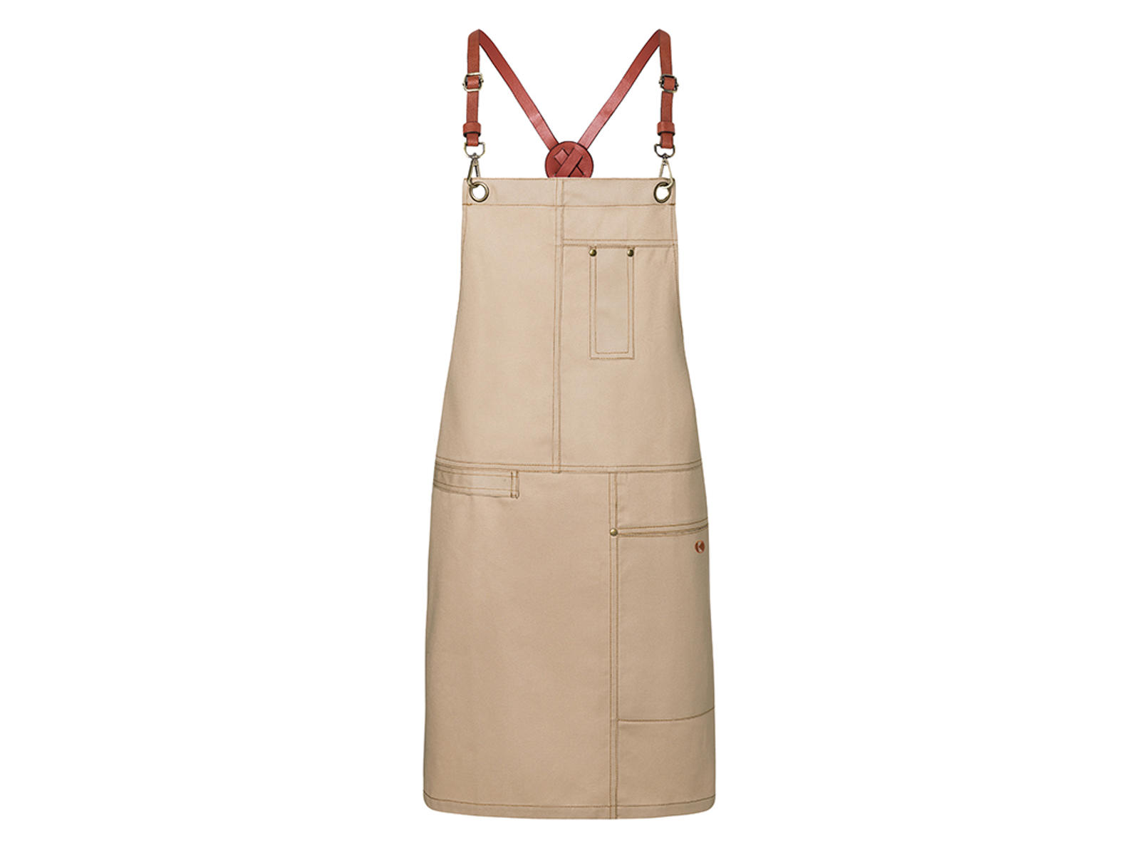 Detta sandfärgade förkläde med läderrem från Karlowsky kombinerar funktionalitet med rå estetik. Med sina 68x80 cm täcker det effektivt arbetsområdet, medan de avtagbara läderremmarna ger ett rustikt uttryck utan att kompromissa med komforten. Förklädet är tillverkat av 100% bomull med en vikt på 273 g/m², vilket säkerställer god hållbarhet i hektiska arbetsmiljöer.