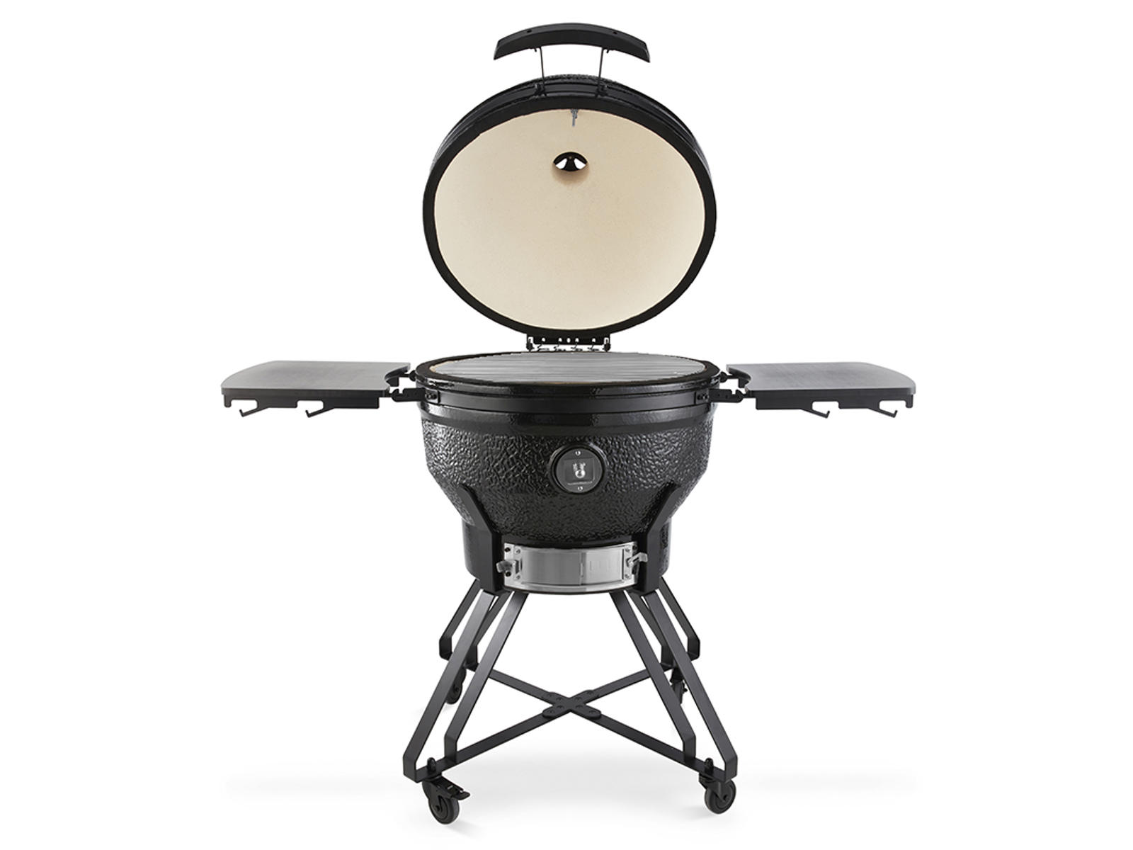 Denna premium Kamado keramikgrill i svart med en diameter på 66 cm kombinerar robust konstruktion med mångsidig matlagning. De keramiska väggarna och pulverlackerade ståldelarna säkerställer optimal värmekontroll och hållbarhet, medan justerbara luftöppningar ger dig exakt temperaturstyrning. Idealisk för både grillning, rökning, bakning och ångning av dina favoritmåltider.