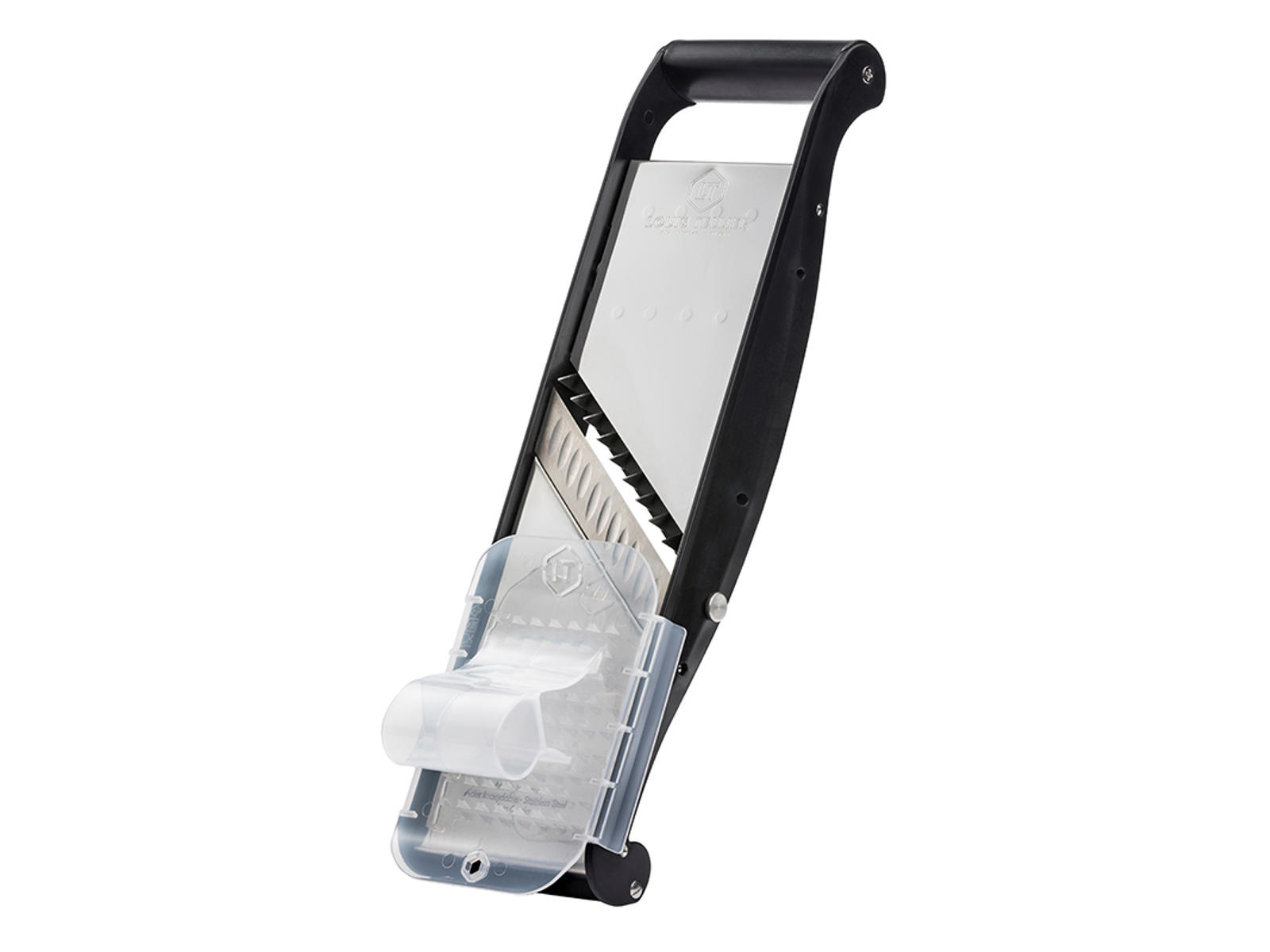 Detta mandolinjärn från Louis Tellier har en skärbredd på 95 mm och justerbar skärdjup från 0,5 till 10 mm. Konstruktionen i rostfritt stål och PP (polypropylen) säkerställer både hållbarhet och hygien. Levereras med två julienneblad på respektive 4 mm och 10 mm samt en säkerhetsskydd. Det diagonala bikakade bladet är tillverkat i Thiers, Frankrike, och designat för att minimera fastklibbing av råvaror.