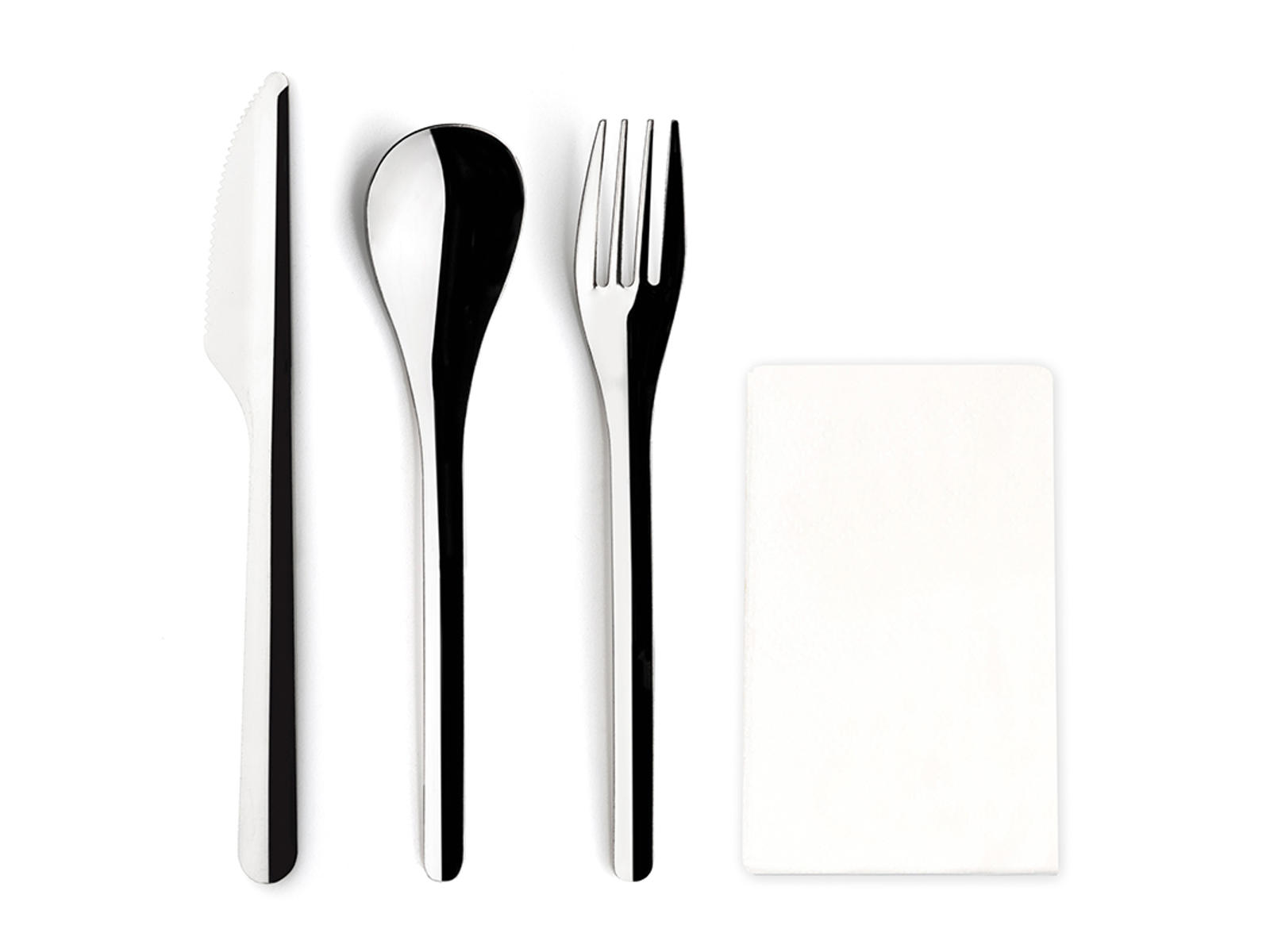 - Komplett set med kniv, gaffel, sked och servett i en praktisk lösning