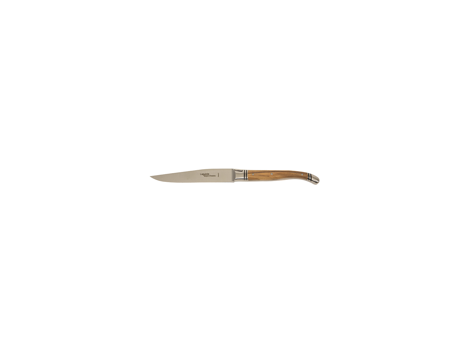 Handtaget i olivträ har valts inte bara för sina estetiska kvaliteter, utan också för den behagliga känslan i handen. Den naturliga strukturen i träet ger ett säkert grepp, medan knivens balans säkerställer precis skärning. Det rostfria stålbladet håller sig skarpt länge och motstår korrosion, vilket gör kniven till ett hållbart val för dina kötträtter. Den karakteristiska franska Laguiole-stilen med rena linjer tillför dessutom en touch av tidlös elegans till din dukning.