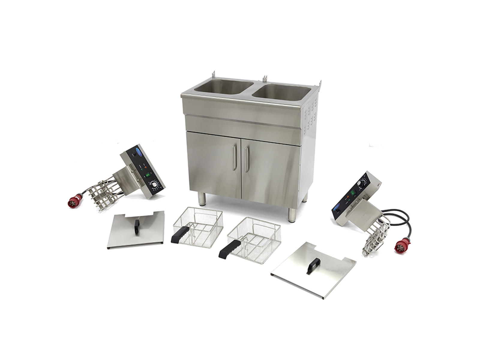 Maxima dubbel fritösen med två 16-liters behållare ger dig optimal kapacitet för hektiska kök. Den rostfria stålkonstruktionen säkerställer lång livslängd, medan de integrerade avtappningskranarna gör oljeutbyte till en enkel uppgift. Med skåpet får du extra förvaringsutrymme för olja och tillbehör, vilket hjälper dig att hålla arbetsområdet organiserat och funktionellt.