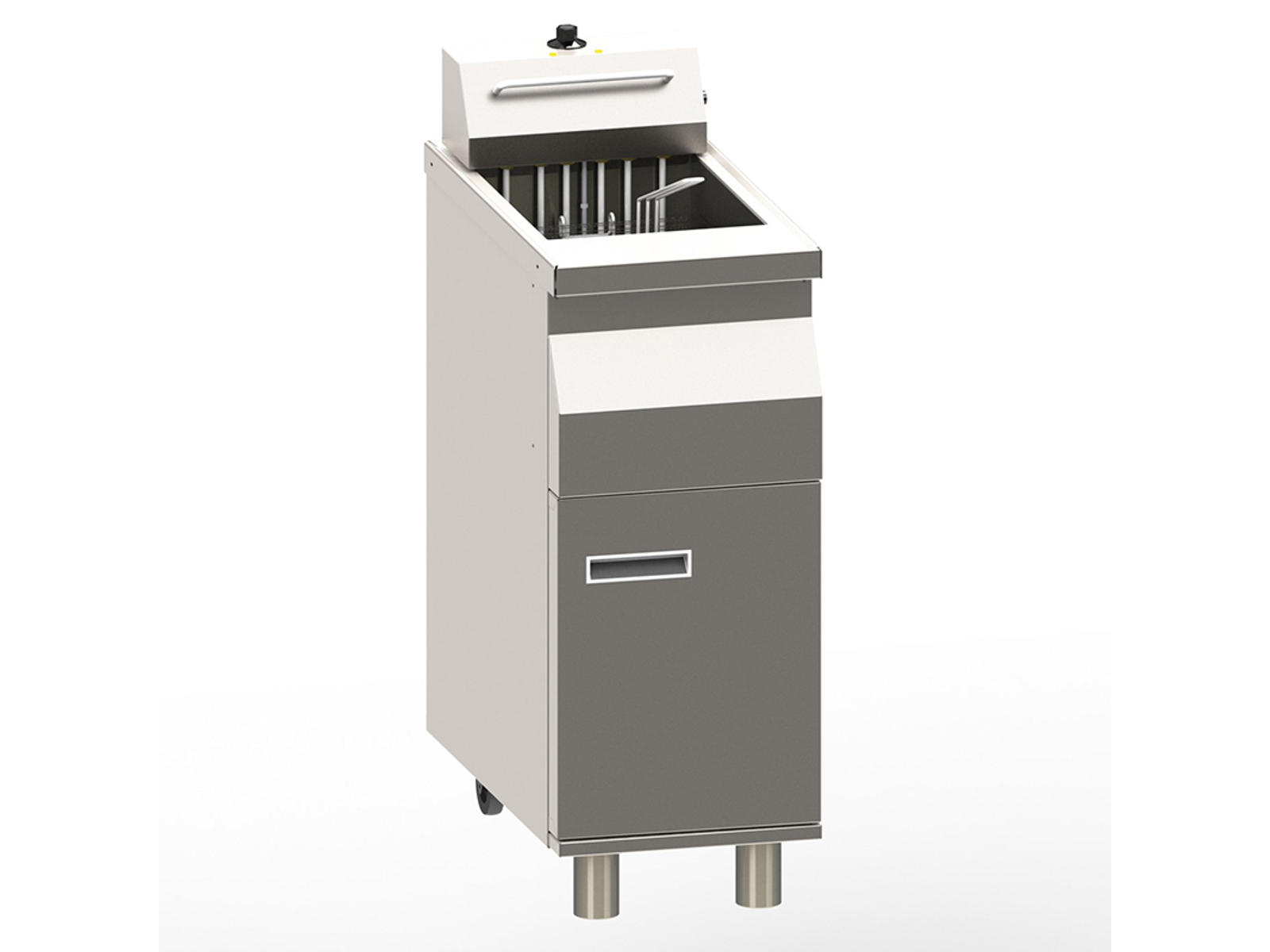 Fritösen är designad med tanke på vardagens drift. Värmeelementen kan lyftas upp, vilket gör rengöring av kärlen snabb och enkel. De medföljande korgarna (1 x 1/1 och 2 x 1/2) ger flexibilitet att fritera olika råvaror samtidigt utan smaköverföring. De kompakta måtten på 700x650x335mm gör fritösen lämplig för bordsmontering, även i kök med begränsat utrymme.