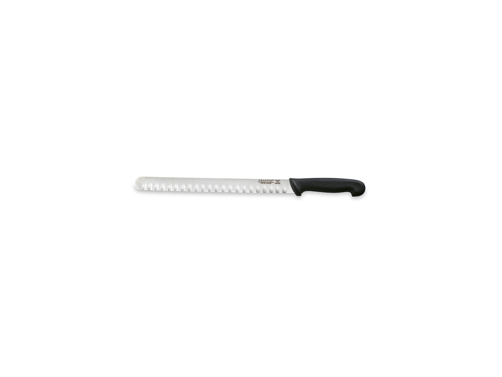 Denna 31 cm långa Granton skinkkniv är designad för precisionsskärning av skinka och andra charkuterivaror. Med sitt långa, smala blad i Sheffield-stål och de karaktäristiska luftskären på båda sidor om klingan säkerställs minimal friktion och maximal kontroll. Det svarta polypropylenhandtaget ger ett säkert grepp vid användning.