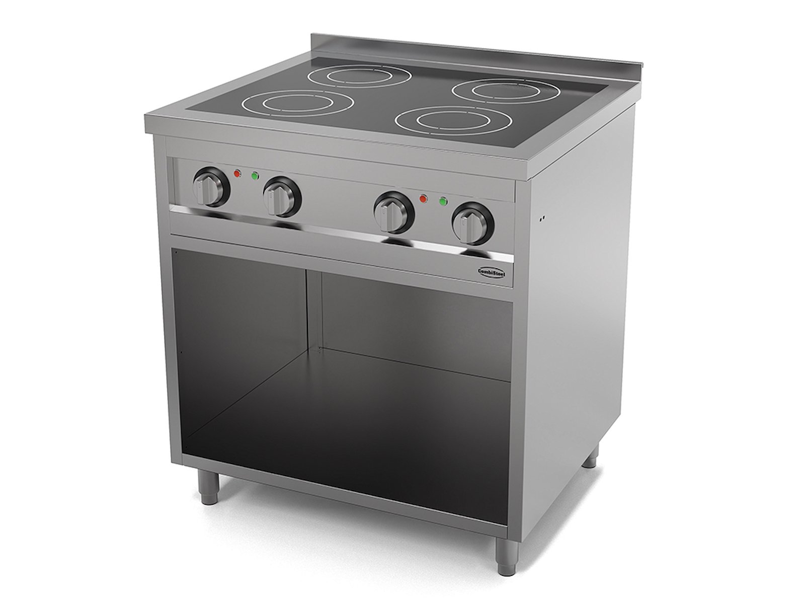 Med fyra separata kokplattor kan kökspersonalen tillaga flera rätter samtidigt utan att kompromissa med kvaliteten. Den robusta konstruktionen är designad för att klara av daglig användning i hektiska professionella kök. Ytan är lätt att rengöra, eftersom matrester inte bränns fast på den svala ytan runt kokzonerna. De standardiserade måtten på 800x700x941 mm säkerställer enkel integration i befintliga kökslinjer och ger ett sammanhängande uttryck.