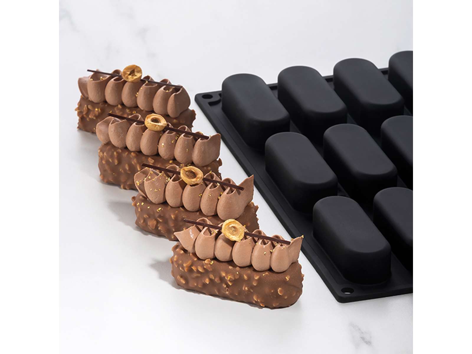 Silikonformen mäter 300x175 mm och har en höjd på 21 mm. De 12 individuella formarna mäter var och en 80x27x21 mm med en kapacitet på 40 ml per form. Den väger 300 gram och är tillverkad av svart livsmedelsgodkänd silikon, som både är hållbar och flexibel. Formens design är skapad för att ge optimal kylning och värmefördelning, vilket säkerställer jämn bakning och snabbare kylning.