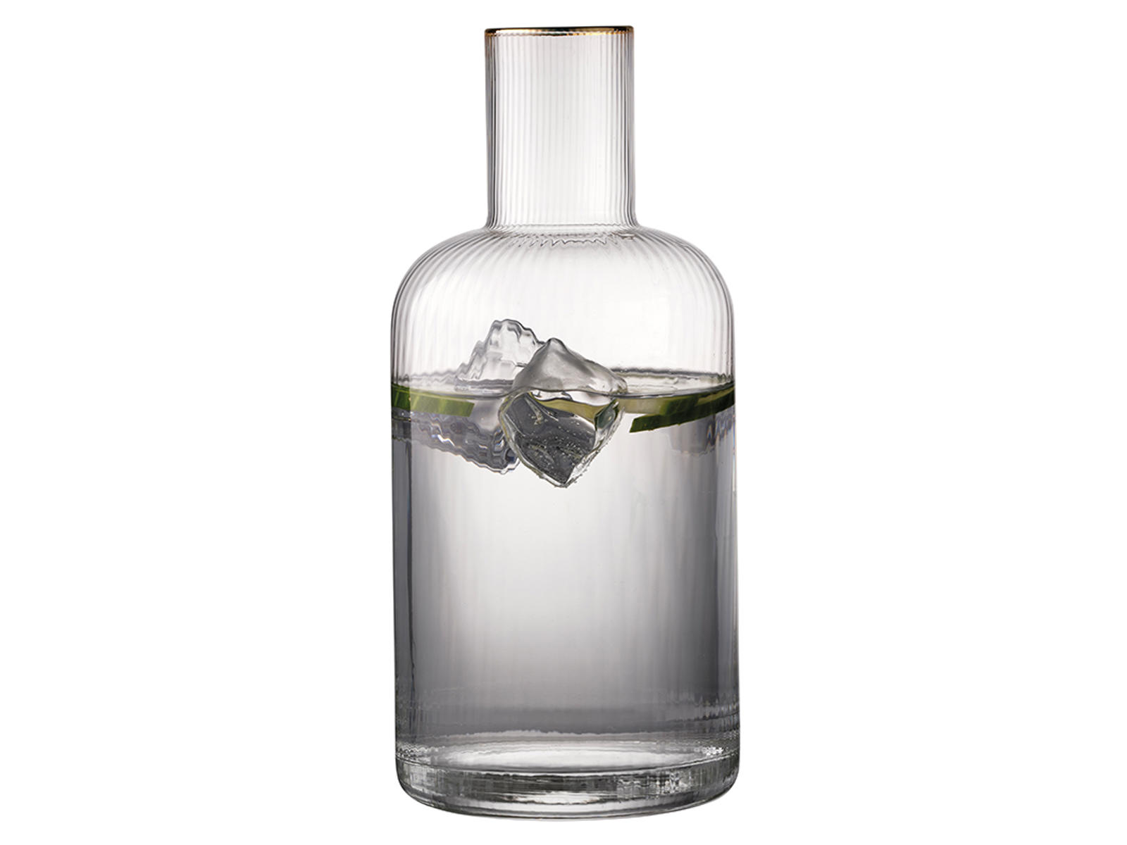 - En stilfuld karaffel med guldkant og riflet design, der tilfører elegance til bordet