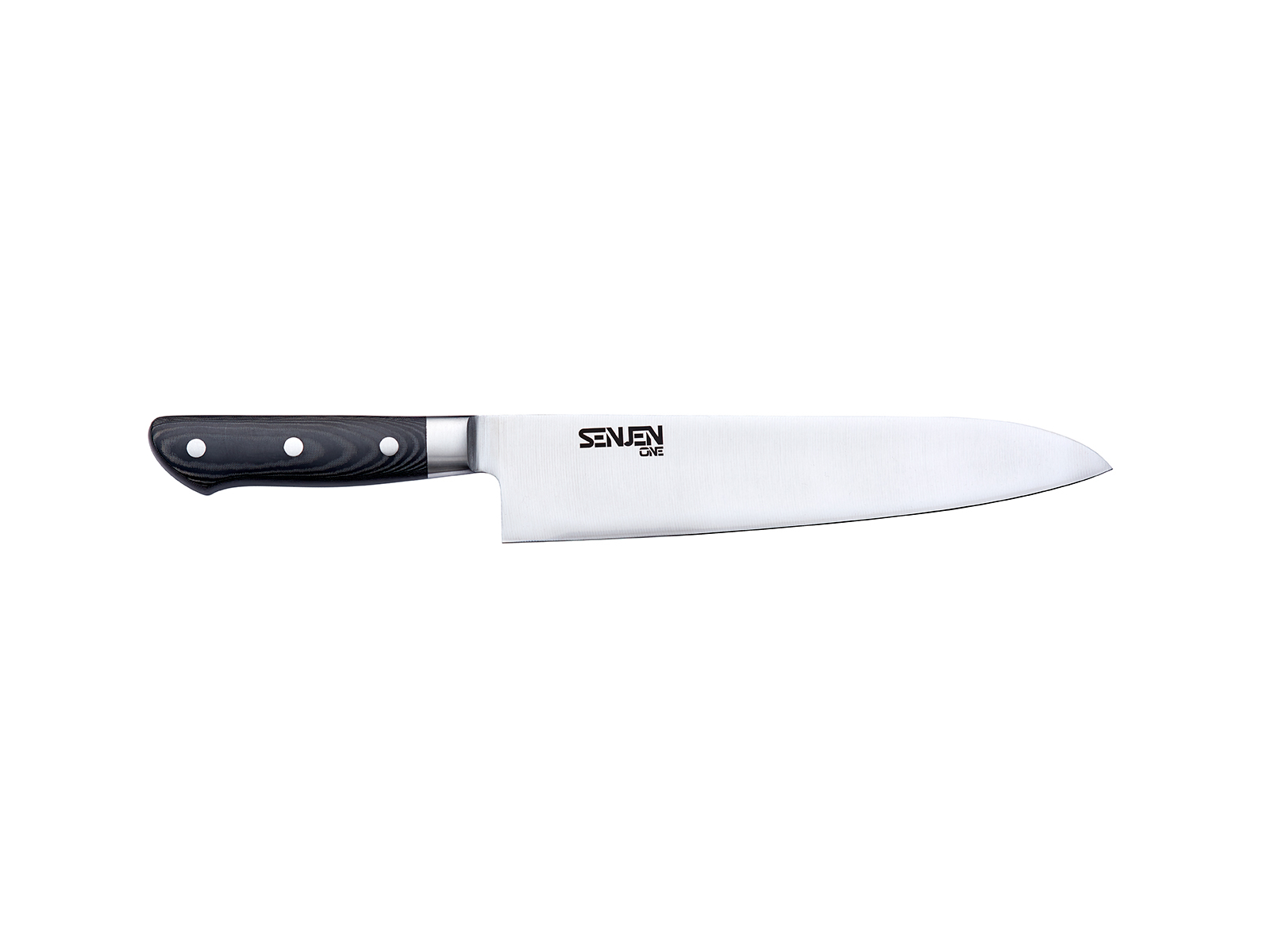 SENJEN ONE Kockkniv är ett högpresterande verktyg med ett 24 cm långt blad i svenskt 12c27 stål. Med sin HRC-hårdhet på 57-58 erbjuder denna enlagerskniv en idealisk balans mellan skärpa och hållbarhet. Det svarta Micarta-handtaget ger ett bekvämt grepp och en elegant träliknande look, medan den västerländska formen säkerställer bra kontroll under användning.