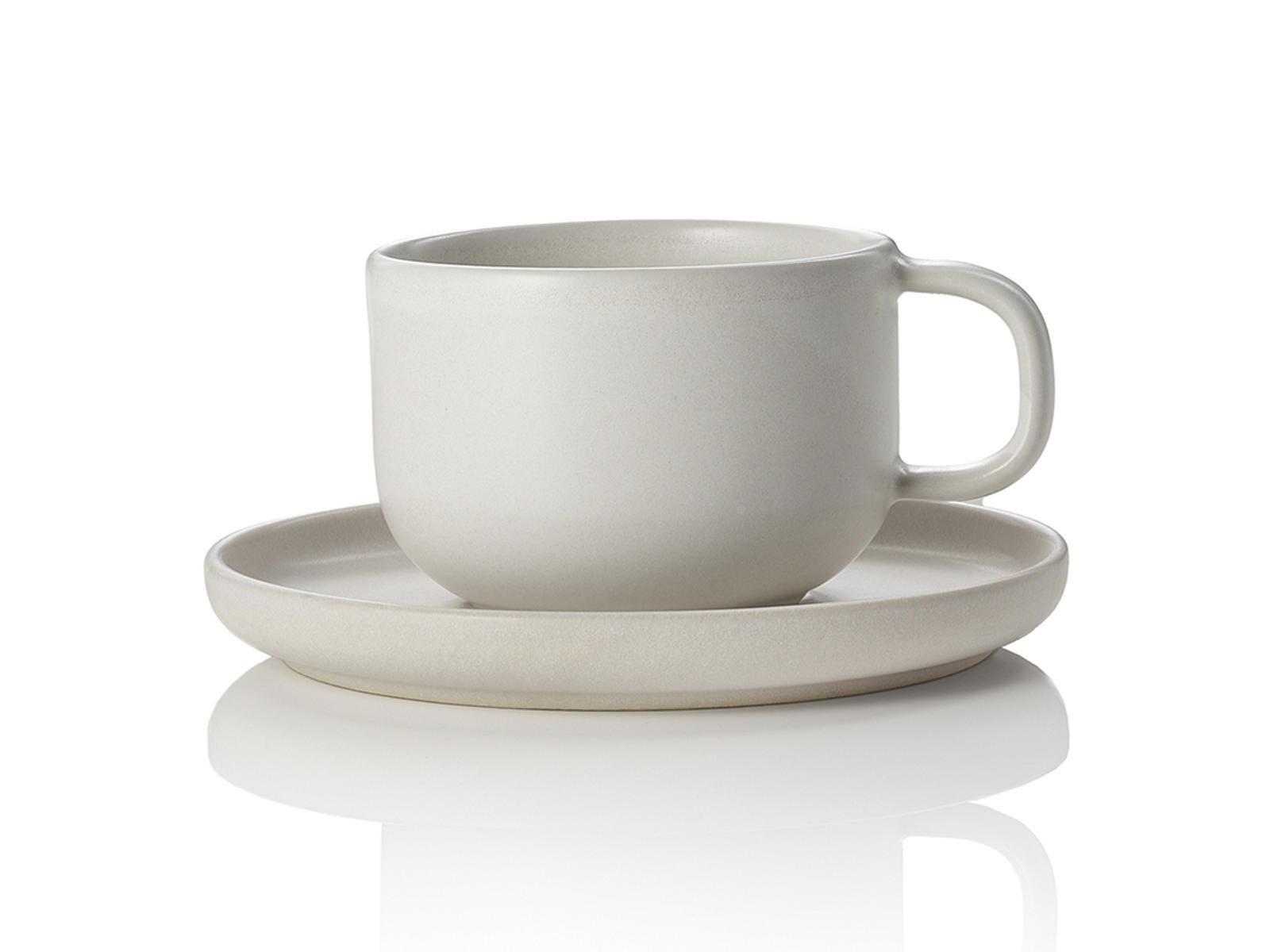 Koppens praktiska handtag säkerställer ett bekvämt grepp, även när innehållet är varmt. Med en diameter på 8,5 cm och en höjd på 60 mm har koppen en bra balans mellan storlek och användarvänlighet. Det medföljande fatet med samma stilrena design skyddar bordet mot spill och värme, vilket gör serveringen både elegant och praktisk. De små variationerna i färg och glasyr, som är karaktäristiska för hantverksproduktionen, ger varje stycke sin egen unika karaktär.