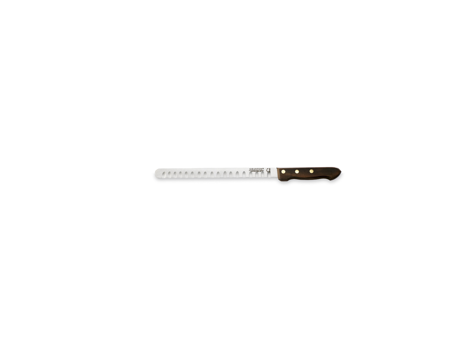 De karakteristiska Granton luftskären på knivbladet minskar friktionen markant under skärningen. Detta förhindrar att fisken fastnar på bladet och gör det möjligt att skära i en sammanhängande rörelse. Den långa bladet på 26 cm gör att du kan skära hela skivor i ett snitt, vilket resulterar i jämna, professionellt utseende skivor varje gång. Trähandtaget är utformat för att ge ett säkert grepp, även med blöta händer.