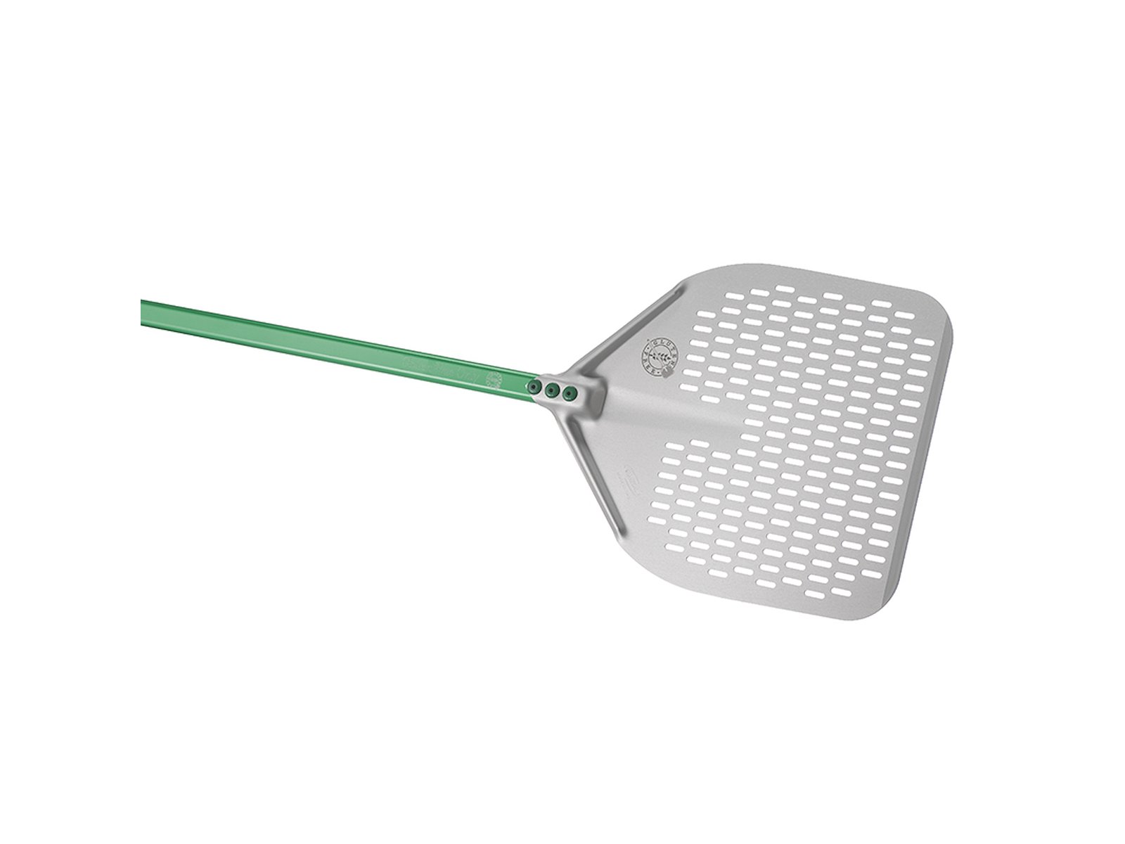 Denna pizzaspade med måtten 33x33 cm och ett 150 cm långt skaft är speciellt utvecklad för professionell hantering av pizzor. Den perforerade skopan säkerställer att överflödig mjöl faller av, vilket gör att du undviker den bittra smaken av bränt mjöl på dina pizzor. Med namnet "Gluten" signalerar denna pizzaspade kvalitet och funktionalitet för den seriösa pizzabagaren.