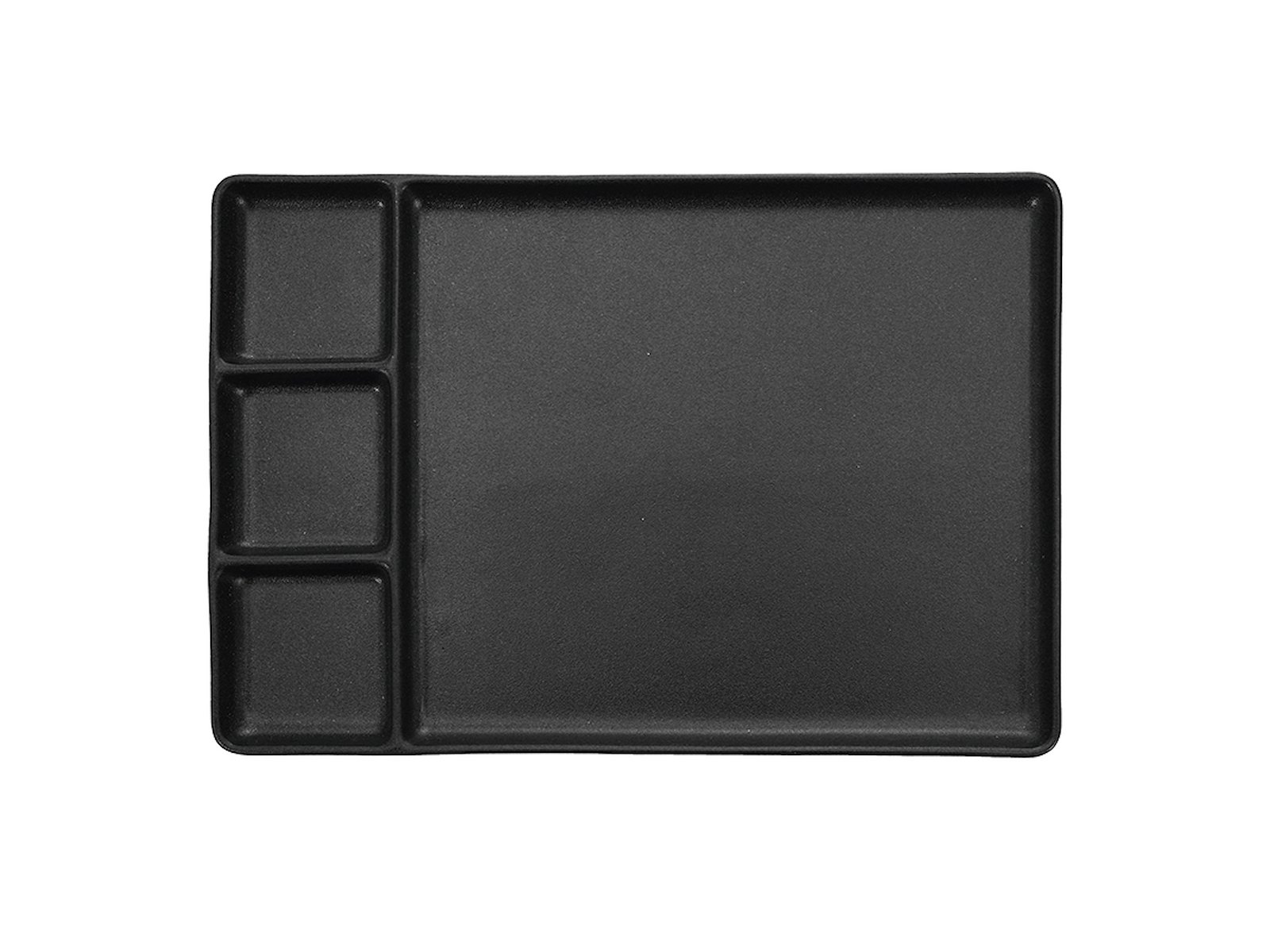 RAW-tallriken i Titanium Black är en handgjord keramikprodukt med en praktisk rumindelning som gör serveringen både funktionell och stilfull. Tallriken har tre mindre fack plus ett större, vilket skapar perfekta områden för olika tapas, sushi eller andra små serveringar. Den rektangulära formen i kombination med den djupa svarta glasyr ger ett stilrent nordiskt uttryck till din dukning.