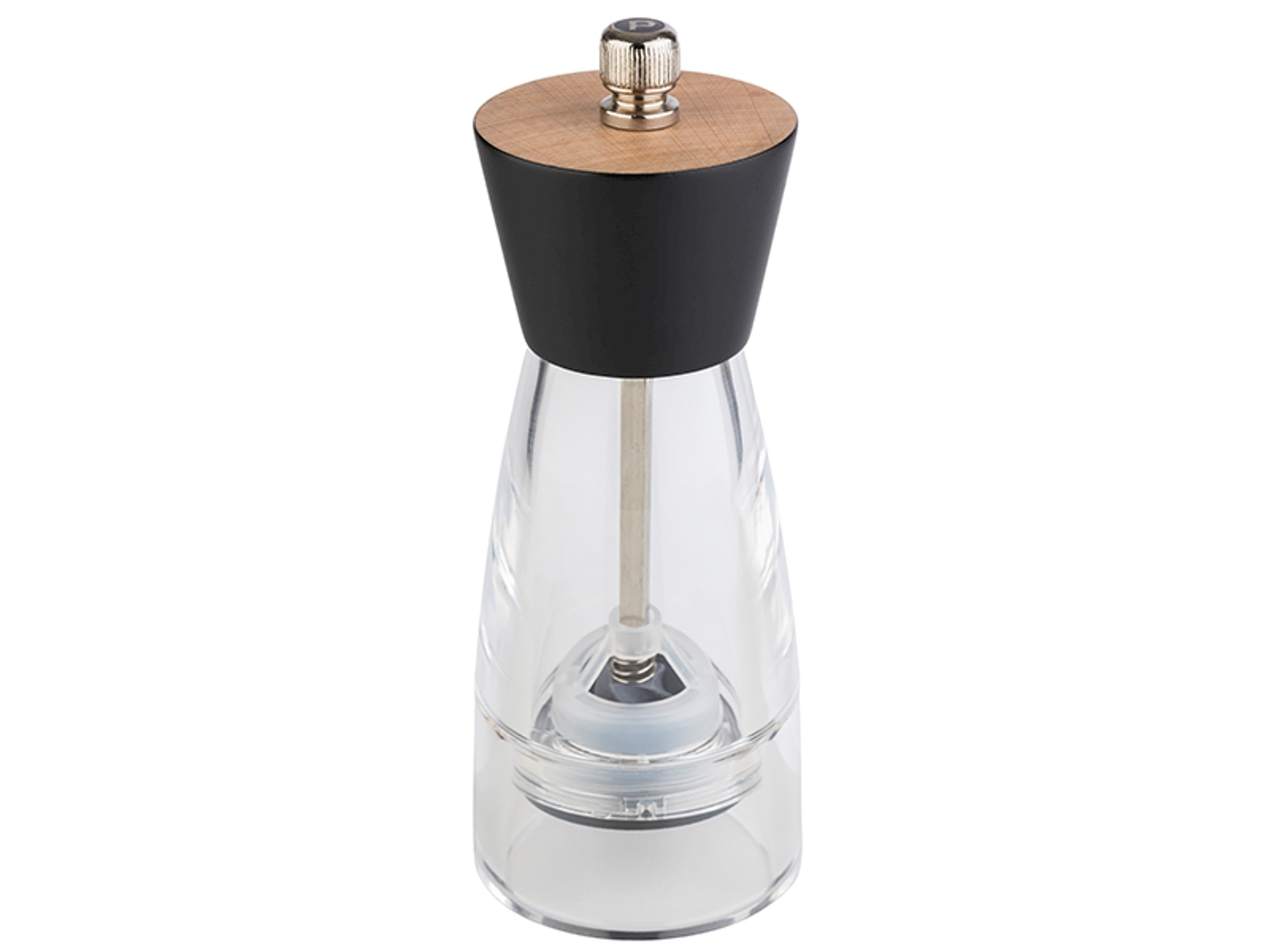 Den 15,5 cm höga pepparkvarnen har en elegant design med en transparent akrylbehållare som gör det lätt att se när den behöver fyllas på. Det svarta och träfärgade locket ger ett raffinerat uttryck som passar både moderna och klassiska kök. Med en diameter på 60 mm ligger den bra i handen under användning och tar minimal plats på bordet eller i köksskåpet.