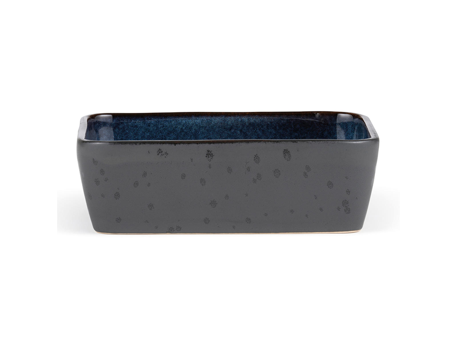 Detta rektangulära fat från Bitz kombinerar elegant design med praktisk funktionalitet. Med sina 19x14 cm och en höjd på 6 cm ger fatet ett stilfullt uttryck genom kontrasten mellan den matta svarta stengodsytan på utsidan och den blanka mörkblå glasyren på insidan. Den reaktiva glasyren skapar unika nyanser och mönster som gör varje fat till ett individuellt stycke.