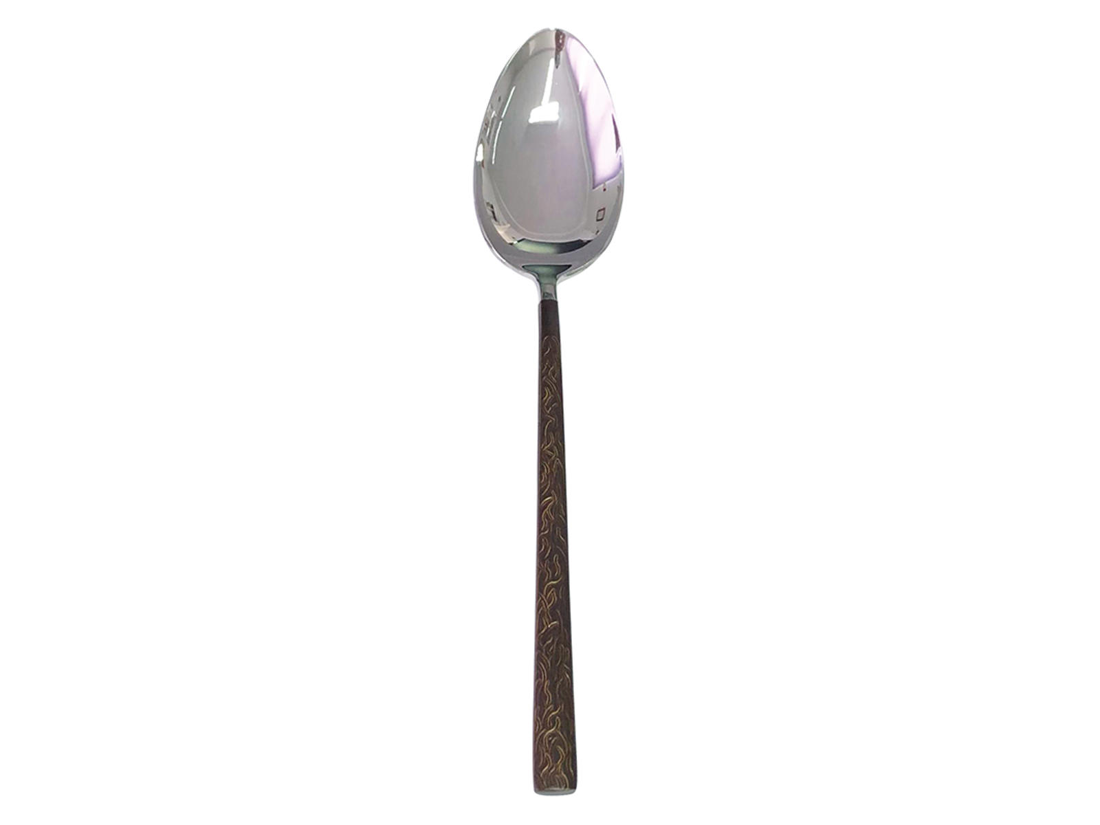 Det rostfria stålet säkerställer att skeden håller sig vacker i många år framöver utan att rosta eller tappa sin glans. Materialet är dessutom otroligt enkelt att rengöra och underhålla. Handtaget med det eleganta läderdesign ger ett bra grepp och tillför samtidigt ett exklusivt utseende som skiljer sig från vanliga bestickdelar. Den genomtänkta kombinationen av material gör skeden både praktisk och visuellt tilltalande.
