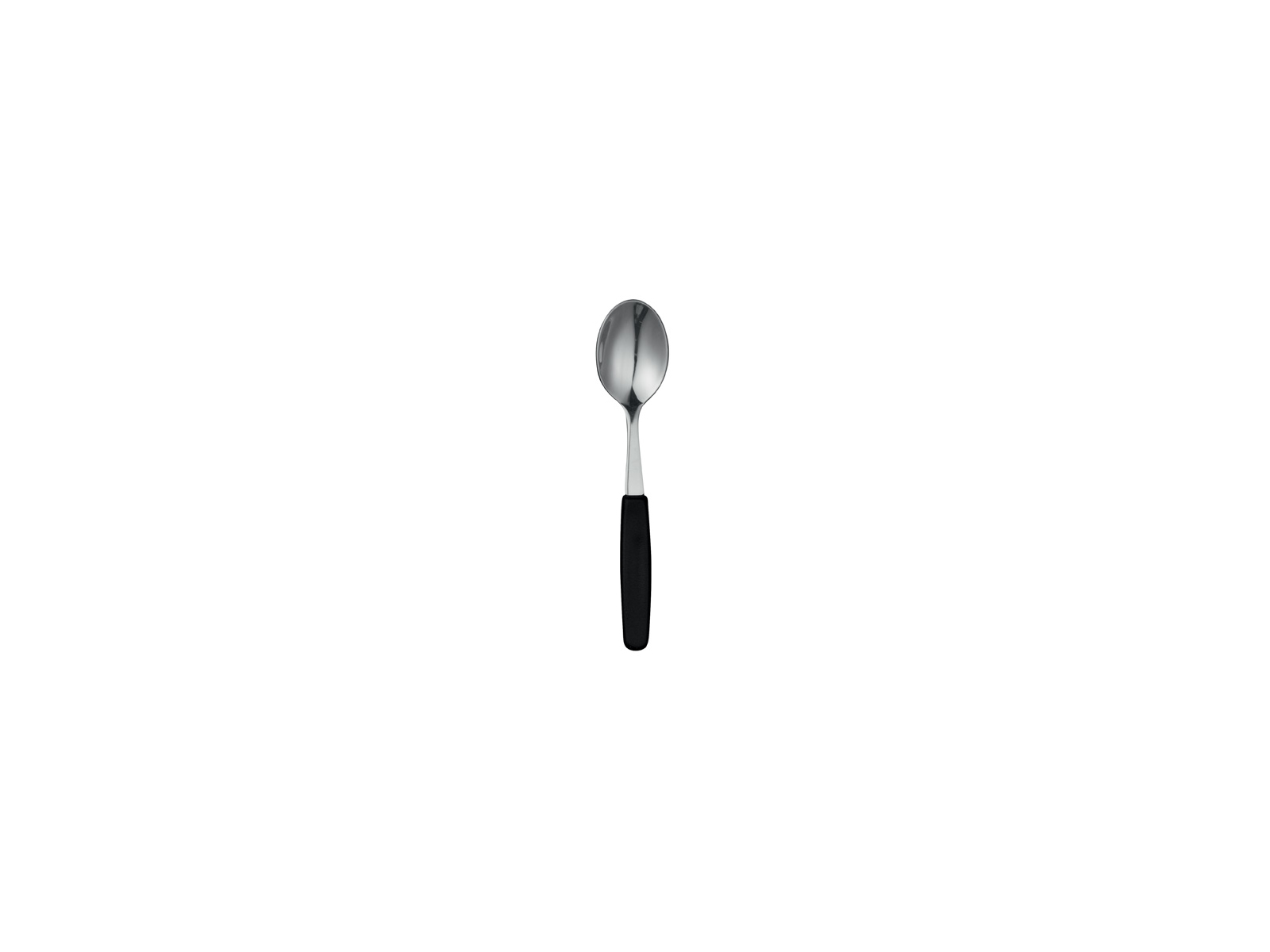 Det svarta handtaget i hård plast ger ett säkert grepp, även med våta händer. Kombinationen av rostfritt stål och kvalitetsplast säkerställer att teskeden kan motstå daglig användning utan att förlora sin funktionalitet eller estetiska uttryck. Den måttliga vikten på 26 gram gör den bekväm att använda, även vid längre tids användning.