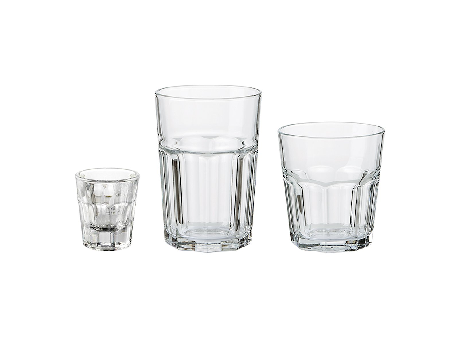 De höga glasen fungerar utmärkt för café latte, juice eller cocktails, medan de låga glasen är idealiska för vatten, whisky eller mindre serveringar. Shotglasen fulländar setet och ger dig möjlighet att servera avec eller shots. Det diskreta mönstret i glaset ger inte bara ett stiligt utseende, utan också ett bra grepp, så att glasen ligger behagligt i handen. Den genomtänkta storleksdifferensen mellan glasen säkerställer att du har precis rätt glas för varje typ av dryck.